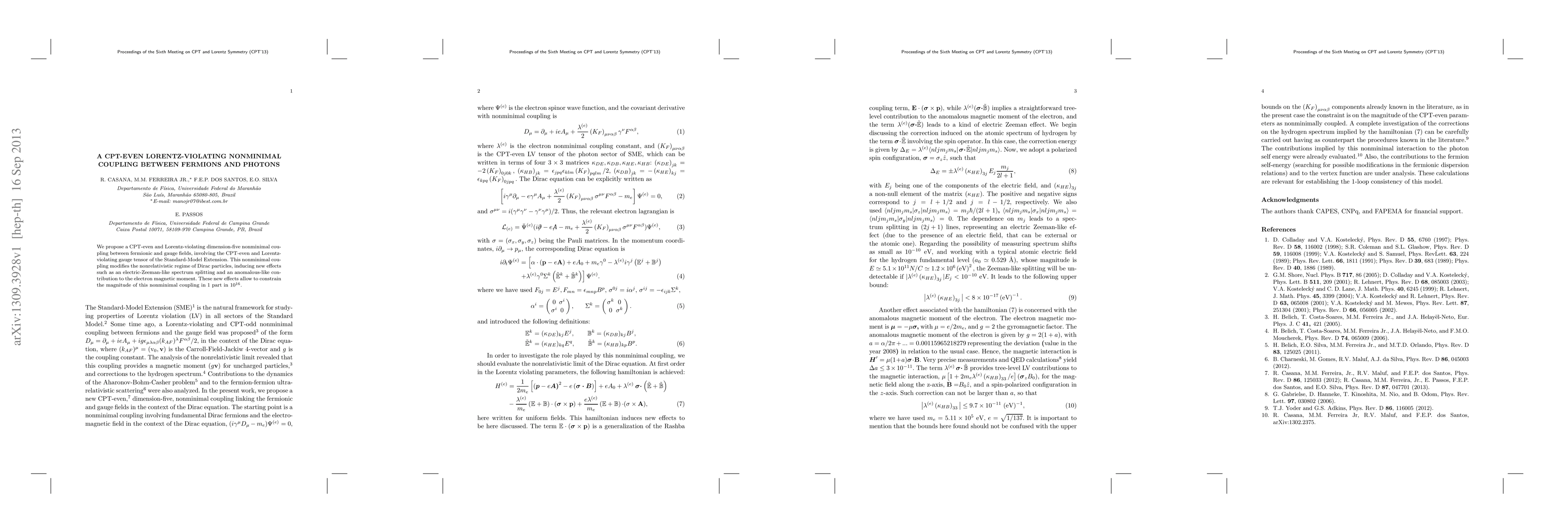 This paper introduces a CPT-even and Lorentz-violating dimension-five nonminimal coupling between fermions and photons, predicting new effects such as electric-Zeeman-like splitting and an anomalous electron magnetic moment, with constraints on the coupling magnitude set at $10^{-16}$.
