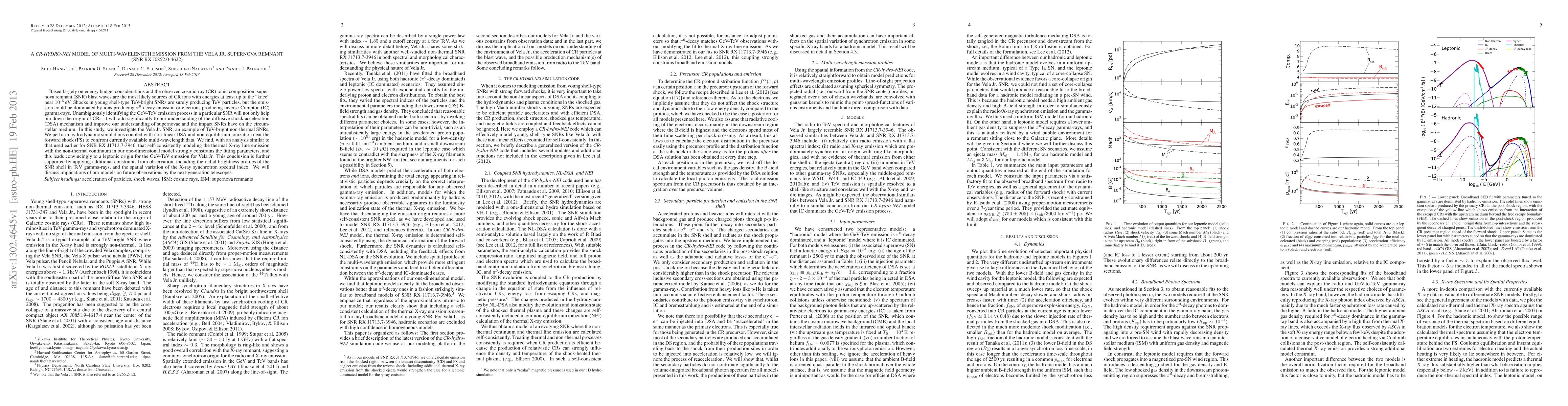 This paper investigates the Vela Jr. supernova remnant (SNR) using hydrodynamic simulations and non-linear diffusive shock acceleration models to determine the origin of GeV-TeV emissions. The study concludes that the GeV-TeV emission is likely leptonic, supported by modeling thermal X-ray lines and non-thermal continuum, and observational constraints.