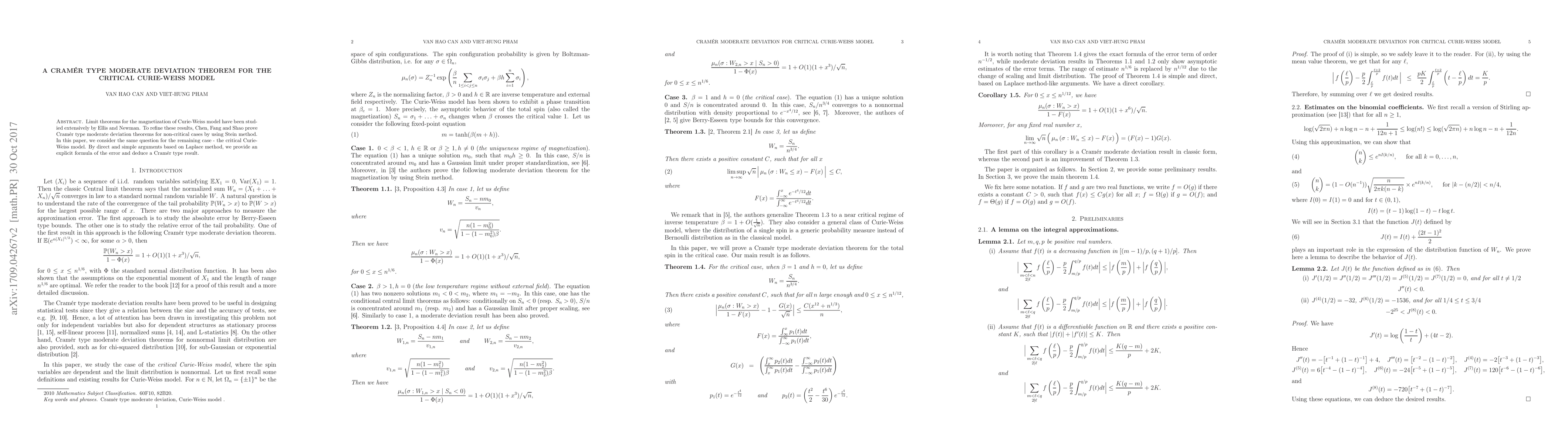 This paper explores moderate deviation principles for the magnetization in the critical Curie-Weiss model, providing an explicit error formula and a Cramér-type result using the Laplace method, contrasting with previous methods applied to non-critical models.