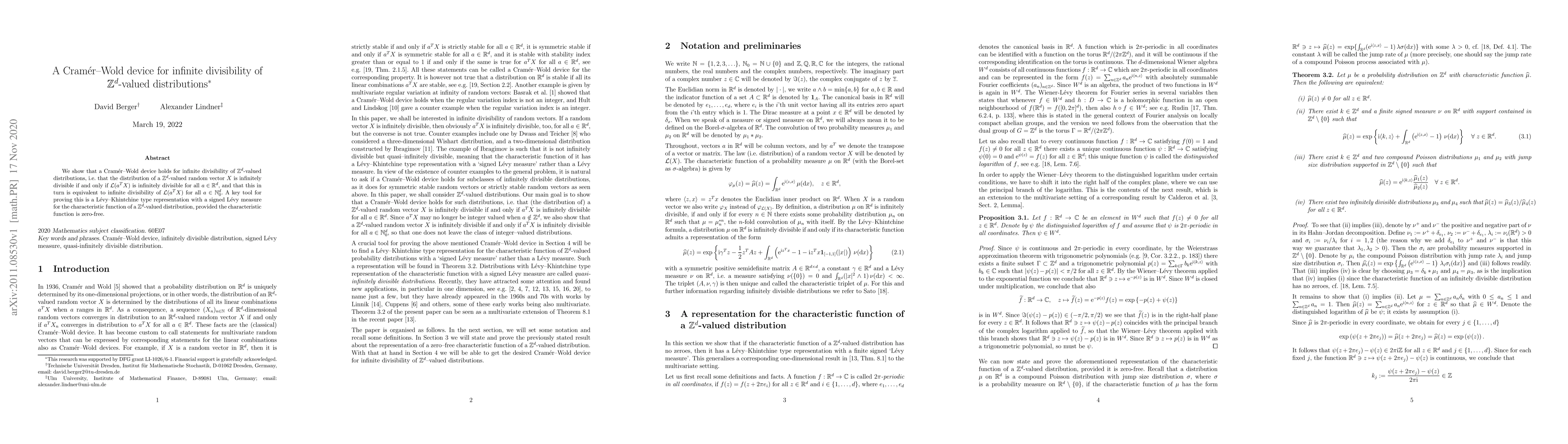 This paper demonstrates the applicability of a Cramér-Wold device for infinite divisibility in $\mathbb{Z}^d$-valued distributions, showing that such distributions are infinitely divisible if linear transformations of the random vector maintain infinite divisibility. The proof utilizes a Lévy-Khintchine representation with a signed Lévy measure for the characteristic function.
