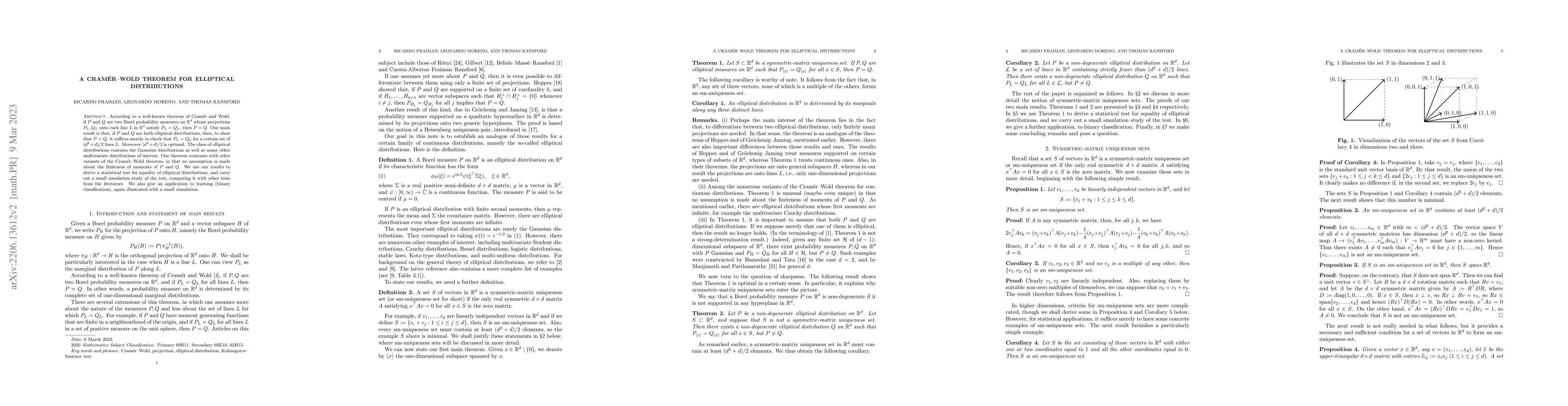 According to a well-known theorem of Cram\'er and Wold, if $P$ and $Q$ are two Borel probability measures on $\mathbb{R}^d$ whose projections $P_L,Q_L$ onto each line $L$ in $\mathbb{R}^d$ satisfy $P_L=Q_L$, then $P=Q$. Our main result is that, if $P$ and $Q$ are both elliptical distributions, then, to show that $P=Q$, it suffices merely to check that $P_L=Q_L$ for a certain set of $(d^2+d)/2$ lines $L$. Moreover $(d^2+d)/2$ is optimal. The class of elliptical distributions contains the Gaussian distributions as well as many other multivariate distributions of interest. Our theorem contrasts with other variants of the Cram\'er-Wold theorem, in that no assumption is made about the finiteness of moments of $P$ and $Q$. We use our results to derive a statistical test for equality of elliptical distributions, and carry out a small simulation study of the test, comparing it with other tests from the literature. We also give an application to learning (binary classification), again illustrated with a small simulation