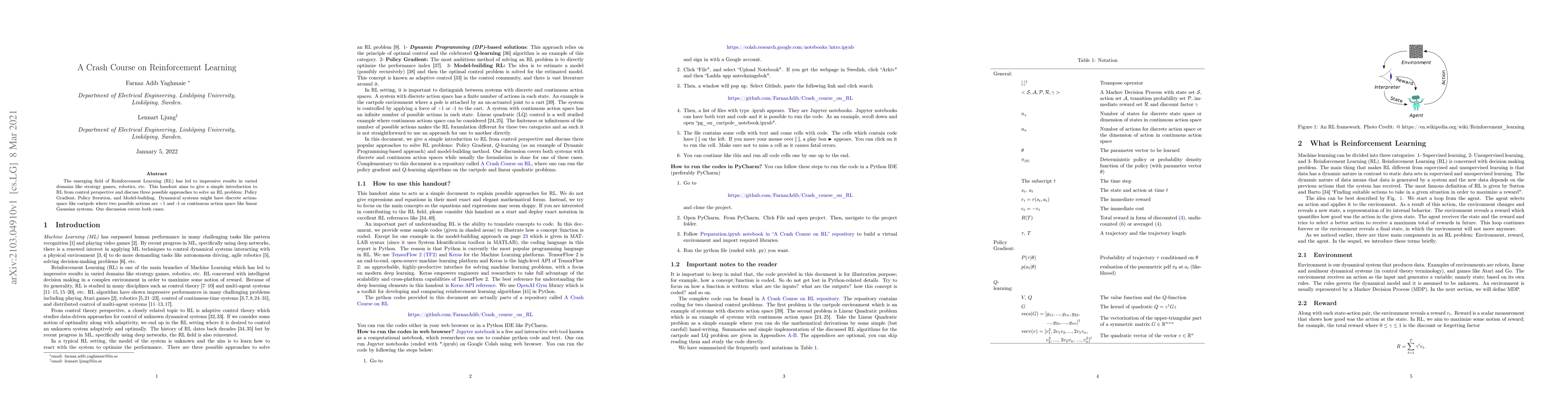 The emerging field of Reinforcement Learning (RL) has led to impressive results in varied domains like strategy games, robotics, etc. This handout aims to give a simple introduction to RL from control perspective and discuss three possible approaches to solve an RL problem: Policy Gradient, Policy Iteration, and Model-building. Dynamical systems might have discrete action-space like cartpole where two possible actions are +1 and -1 or continuous action space like linear Gaussian systems. Our discussion covers both cases.