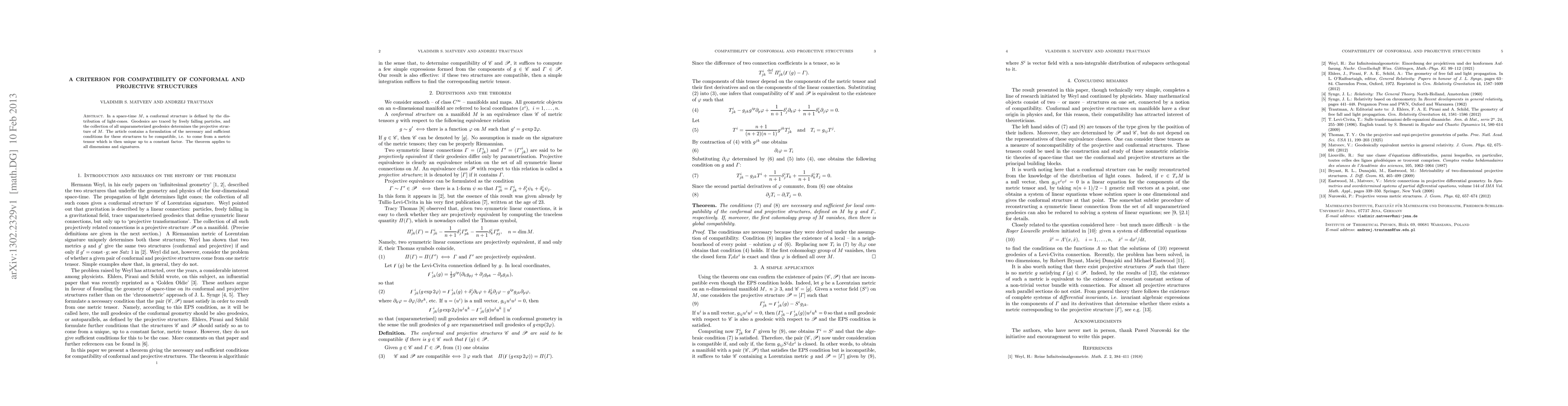 In a space-time, a conformal structure is defined by the distribution of light-cones. Geodesics are traced by freely falling particles, and the collection of all unparameterized geodesics determines the projective structure of the space-time. The article contains a formulation of the necessary and sufficient conditions for these structures to be compatible, i.e. to come from a metric tensor which is then unique up to a constant factor. The theorem applies to all dimensions and signatures.