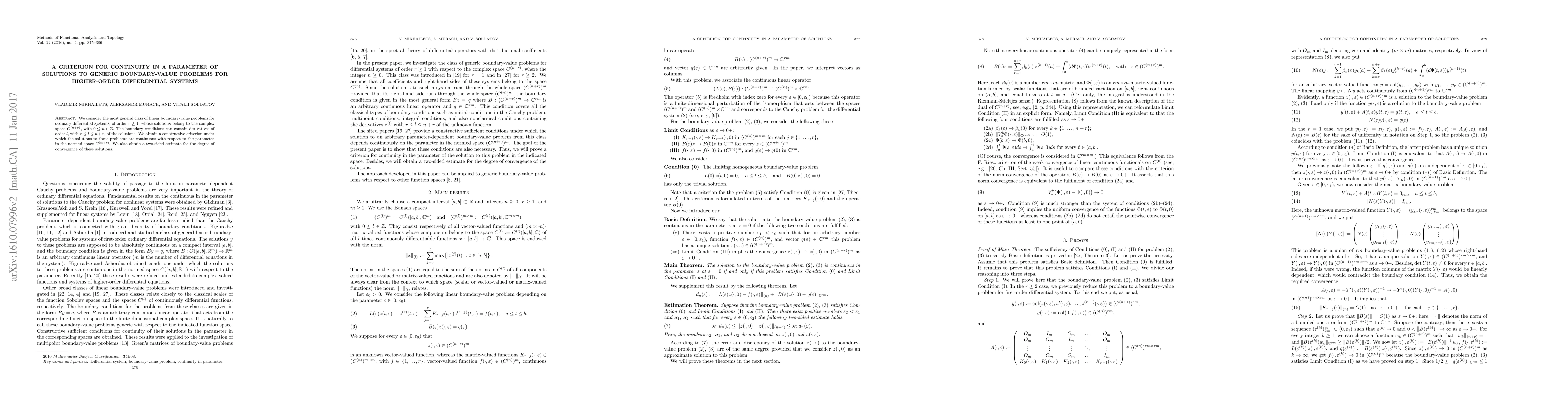 We consider the most general class of linear boundary-value problems for ordinary differential systems, of order $r\geq1$, whose solutions belong to the complex space $C^{(n+r)}$, with $0\leq n\in\mathbb{Z}$. The boundary conditions can contain derivatives of order $l$, with $r\leq l\leq n+r$, of the solutions. We obtain a constructive criterion under which the solutions to these problems are continuous with respect to the parameter in the normed space $C^{(n+r)}$. We also obtain a two-sided estimate for the degree of convergence of these solutions.