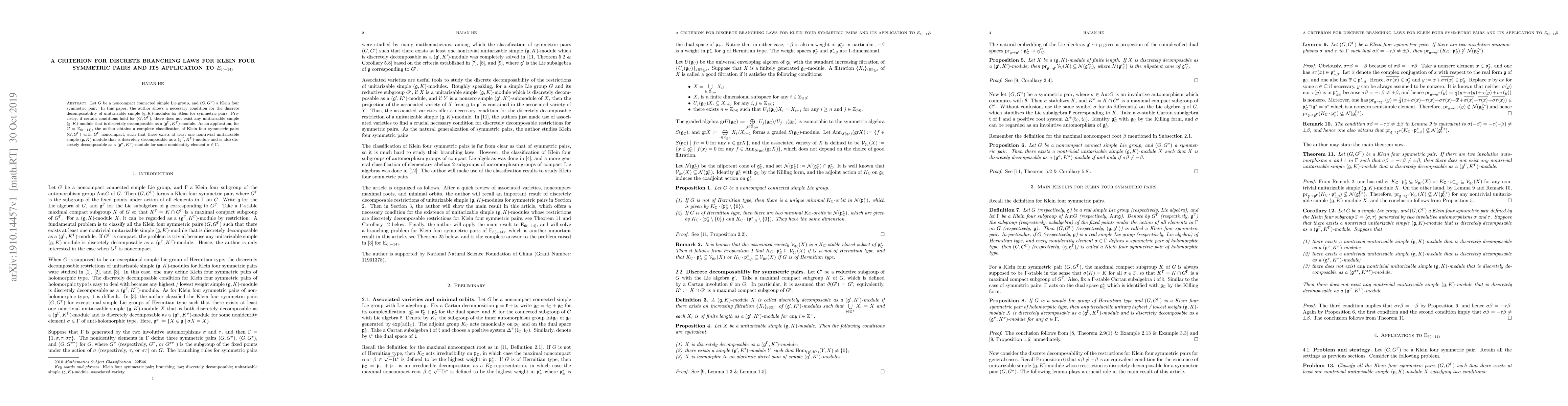 This paper establishes a criterion for the absence of discretely decomposable unitarizable simple $(\mathfrak{g},K)$-modules in Klein four symmetric pairs, and applies it to classify such pairs for $G=\mathrm{E}_{6(-14)}$, showing none exist under certain conditions.