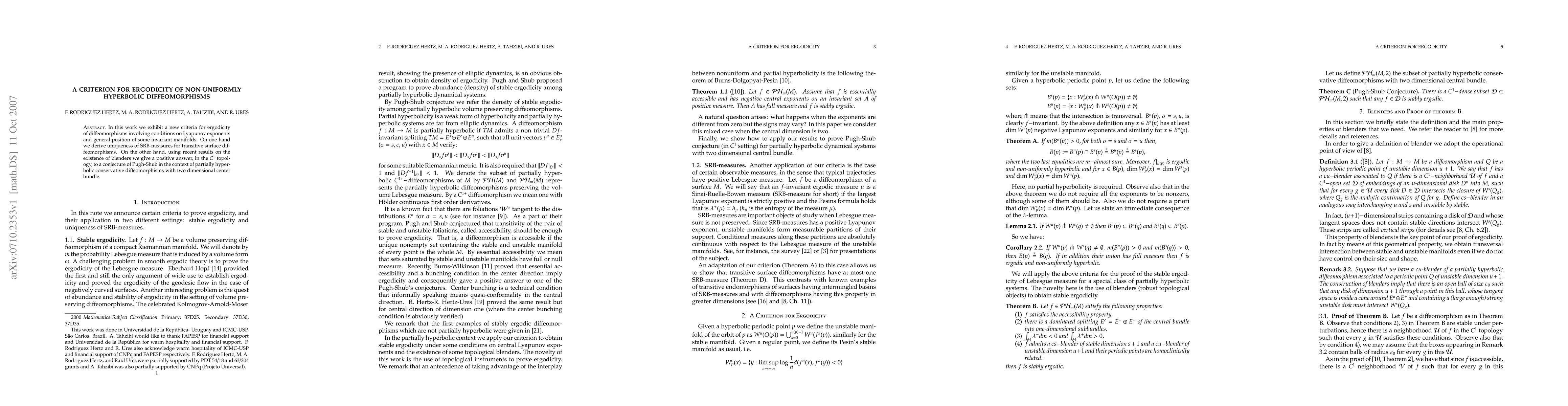Researchers develop a new criterion for ergodicity in non-uniformly hyperbolic diffeomorphisms, proving uniqueness of SRB-measures for transitive surface diffeomorphisms and confirming a Pugh-Shub conjecture in partially hyperbolic conservative systems.