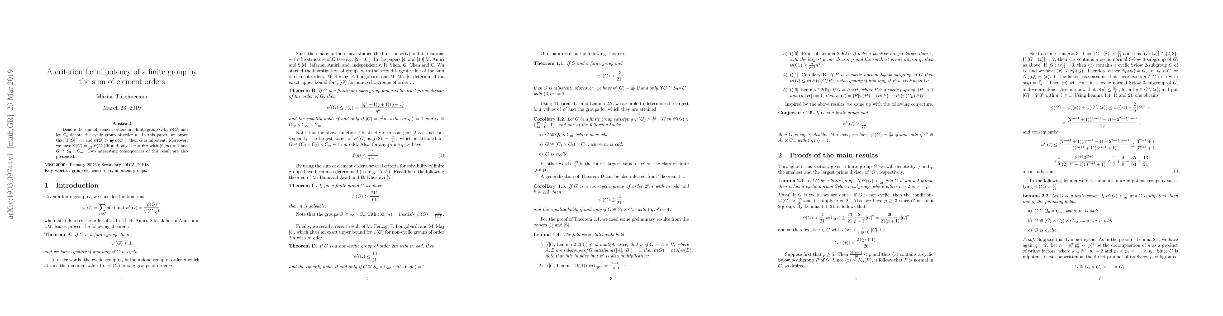 This paper establishes a criterion for the nilpotency of finite groups based on the sum of element orders, denoted as $\psi(G)$. It proves that if $\psi(G) > \frac{13}{21} \psi(C_n)$ for a group $G$ of order $n$, then $G$ is nilpotent. It also identifies the precise conditions under which $\psi(G) = \frac{13}{21} \psi(C_n)$.