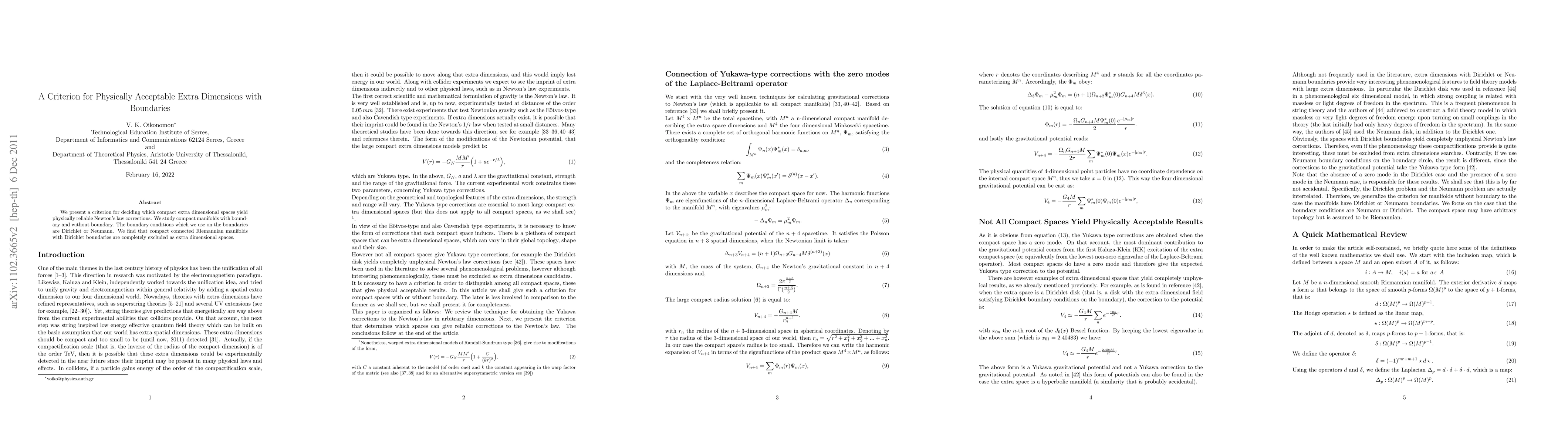 This paper proposes a criterion for determining which compact extra-dimensional spaces provide physically meaningful corrections to Newton's law. It finds that compact Riemannian manifolds with Dirichlet boundaries are excluded as viable extra dimensions.