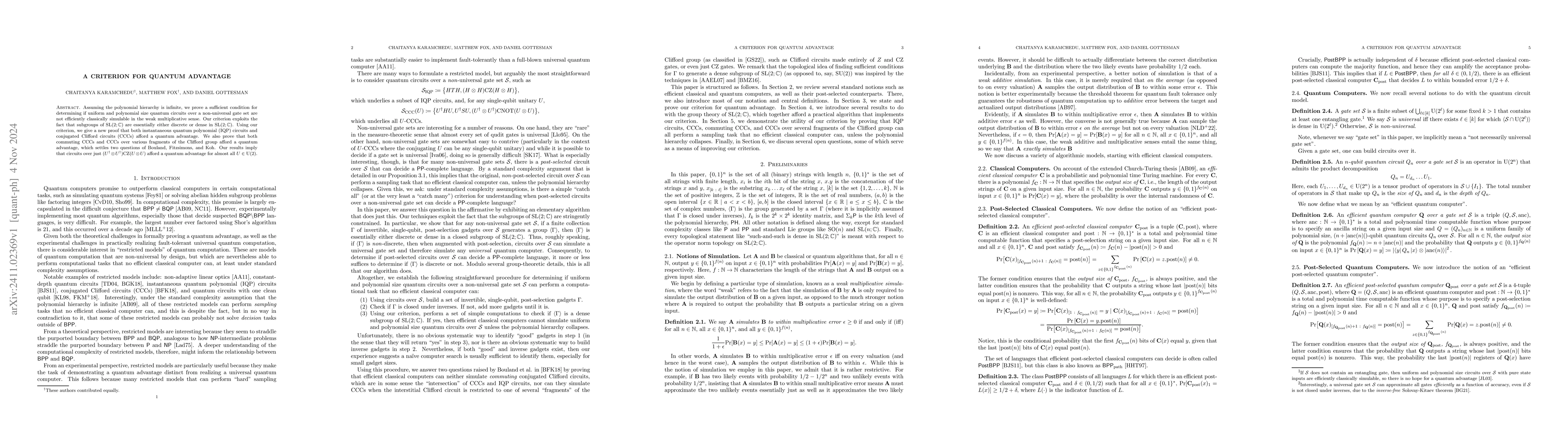 Assuming the polynomial hierarchy is infinite, we prove a sufficient condition for determining if uniform and polynomial size quantum circuits over a non-universal gate set are not efficiently classically simulable in the weak multiplicative sense. Our criterion exploits the fact that subgroups of $\mathrm{SL}(2;\mathbb{C})$ are essentially either discrete or dense in $\mathrm{SL}(2;\mathbb{C})$. Using our criterion, we give a new proof that both instantaneous quantum polynomial (IQP) circuits and conjugated Clifford circuits (CCCs) afford a quantum advantage. We also prove that both commuting CCCs and CCCs over various fragments of the Clifford group afford a quantum advantage, which settles two questions of Bouland, Fitzsimons, and Koh. Our results imply that circuits over just $(U^\dagger \otimes U^\dagger) \mathrm{CZ} (U \otimes U)$ afford a quantum advantage for almost all $U \in \mathrm{U}(2)$.