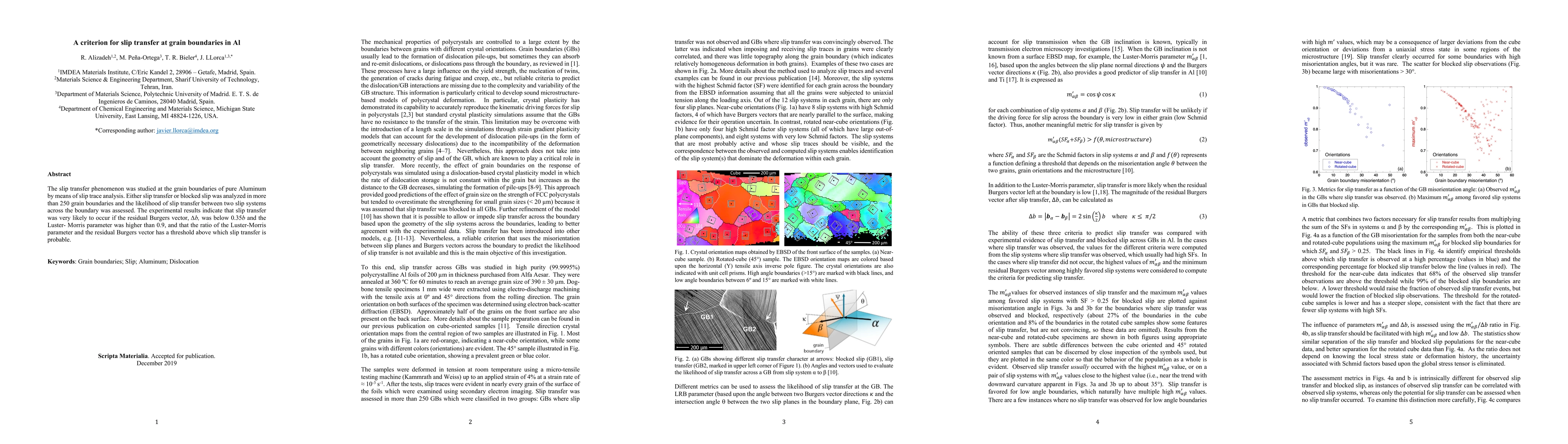 This study investigates slip transfer at grain boundaries in pure aluminum, finding that slip transfer is likely when the residual Burgers vector is below 0.35b and the Luster-Morris parameter exceeds 0.9, with a specific ratio threshold enhancing the probability of slip transfer.