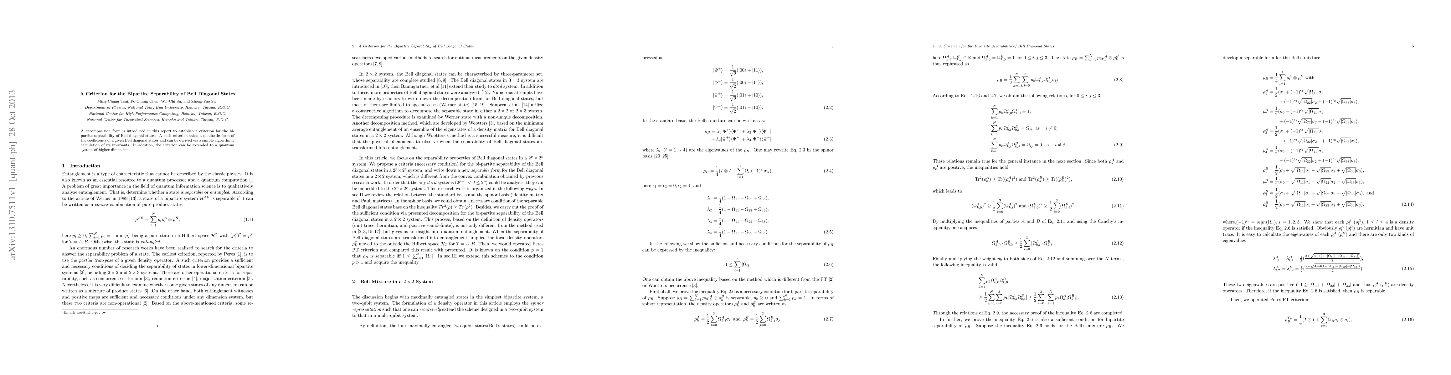 This paper introduces a decomposition form to determine the bipartite separability of Bell diagonal states, utilizing a quadratic criterion based on the state's coefficients, which can be calculated via an algorithmic method and extended to higher-dimensional quantum systems.