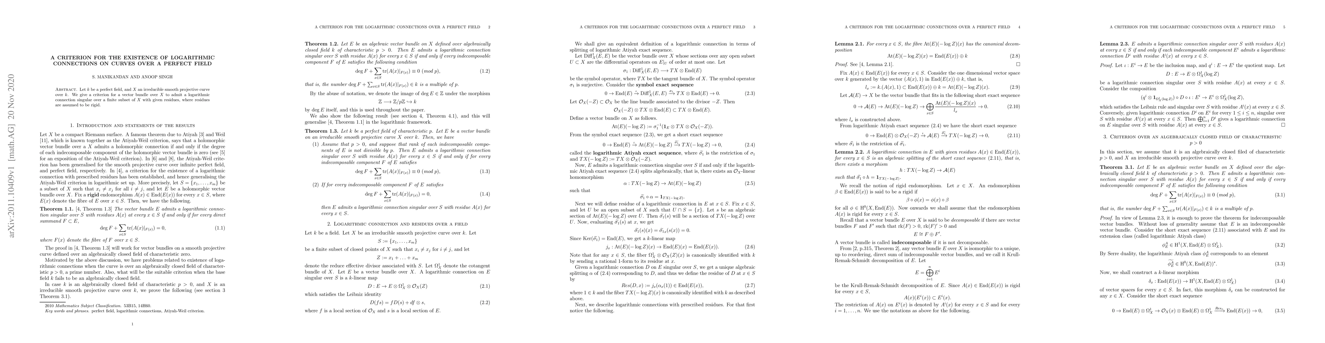 Let $k$ be a perfect field, and $X$ an irreducible smooth projective curve over $k$. We give a criterion for a vector bundle over $X$ to admit a logarithmic connection singular over a finite subset of $X$ with given residues, where residues are assumed to be rigid.