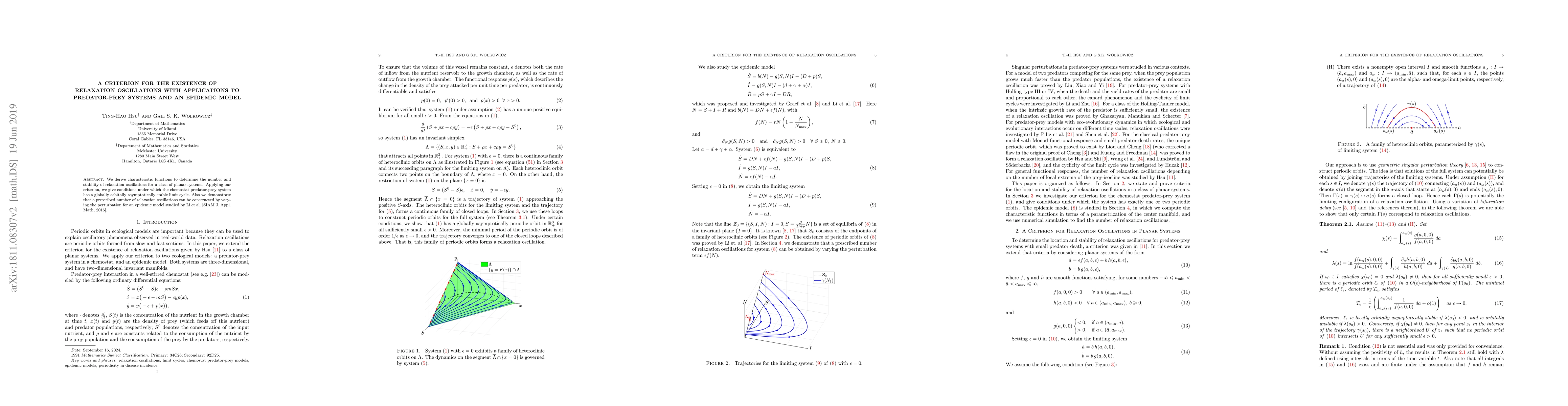 We derive characteristic functions to determine the number and stability of relaxation oscillations for a class of planar systems. Applying our criterion, we give conditions under which the chemostat predator-prey system has a globally orbitally asymptotically stable limit cycle. Also we demonstrate that a prescribed number of relaxation oscillations can be constructed by varying the perturbation for an epidemic model studied by Li et al. [SIAM J. Appl. Math, 2016].