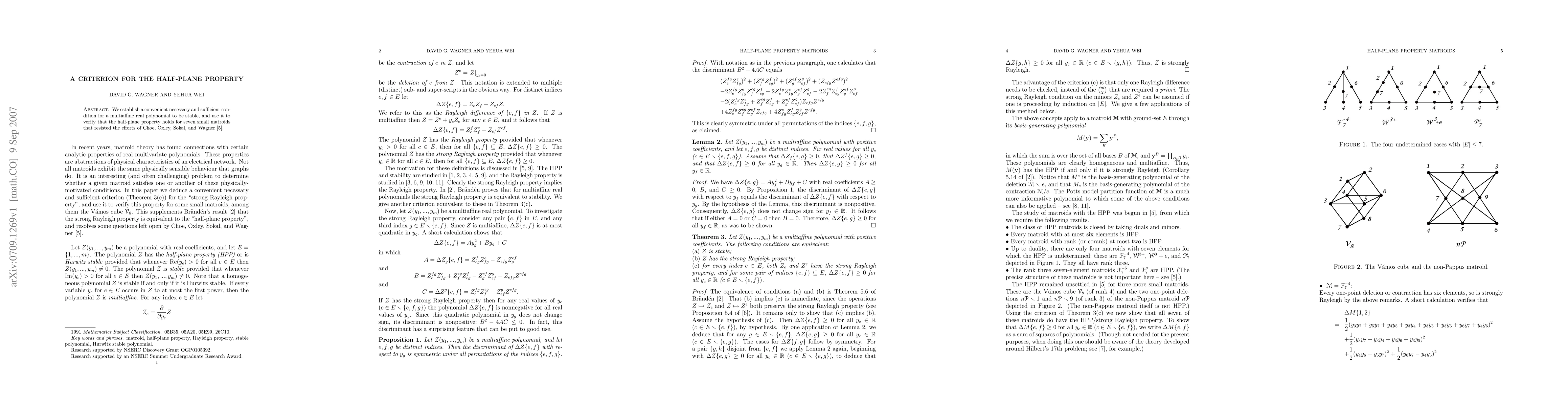 We establish a convenient necessary and sufficient condition for a multiaffine real polynomial to be stable, and use it to verify that the half-plane property holds for seven small matroids that resisted the efforts of Choe, Oxley, Sokal, and Wagner [5].