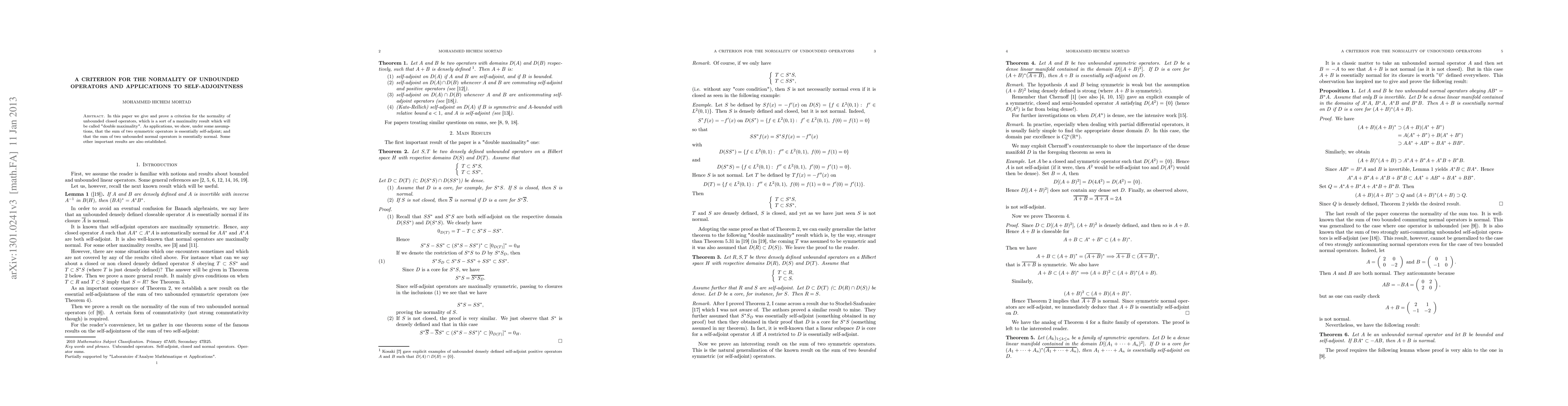 In this paper we give and prove a criterion for the normality of unbounded closed operators, which is a sort of a maximality result which will be called "double maximality". As applications, we show, under some assumptions, that the sum of two symmetric operators is essentially self-adjoint; and that the sum of two unbounded normal operators is essentially normal. Some other important results are also established.