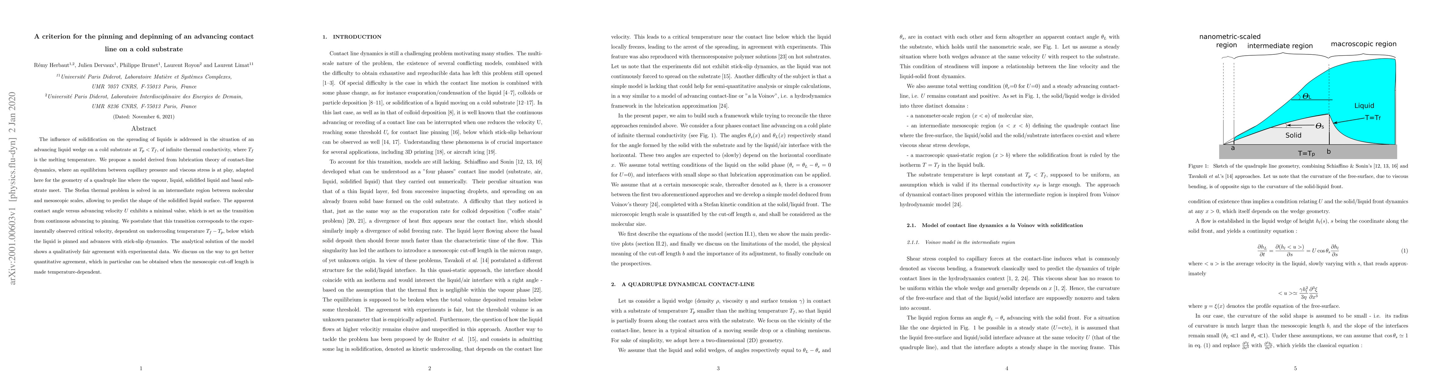 This paper proposes a lubrication theory model to predict the pinning and depinning behavior of an advancing liquid contact line on a cold substrate, where solidification occurs. The model identifies a critical velocity below which the liquid exhibits stick-slip dynamics, matching experimental observations.