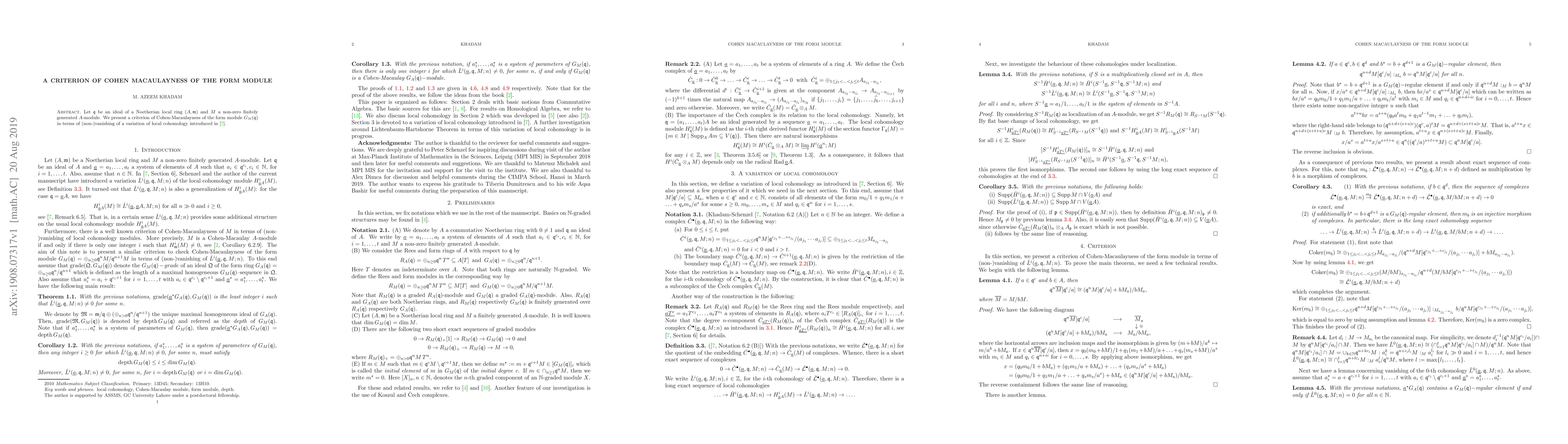 This paper introduces a criterion for the Cohen-Macaulayness of the form module $G_M(\mathfrak{q})$, defined via a specific variation of local cohomology, concerning a non-zero finitely generated $A$-module $M$ over a Noetherian local ring $(A,\mathfrak{m})$.