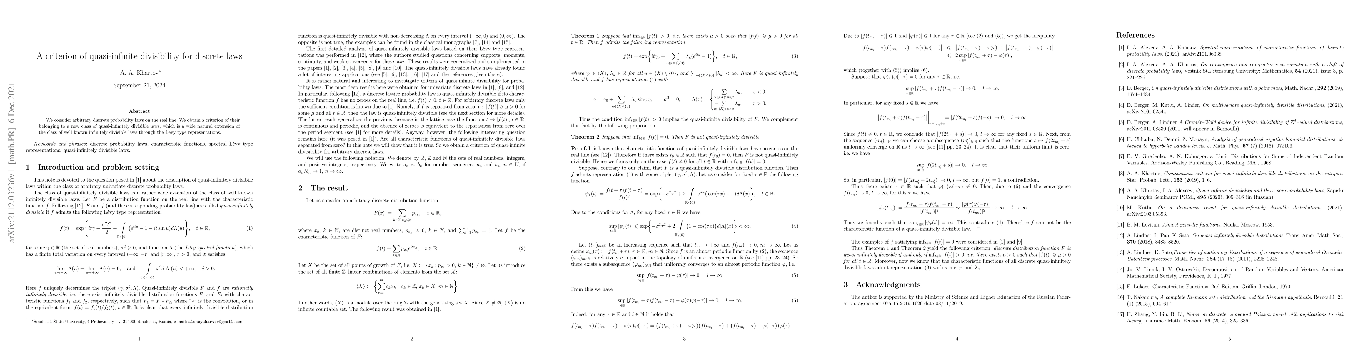 The paper presents a novel criterion for quasi-infinite divisibility of discrete laws based on Lévy type representations, extending the class of infinitely divisible laws.