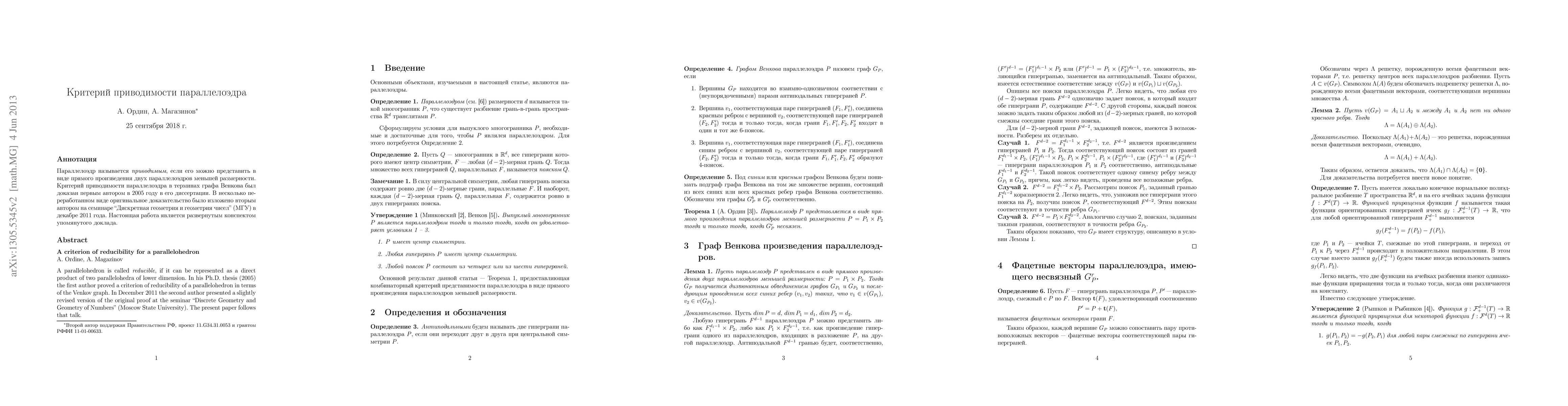 A parallelohedron is called reducible, if it can be represented as a direct product of two parallelohedra of lower dimension. In his Ph.D. thesis (2005) the first author proved a criterion of reducibility of a parallelohedron in terms of the Venkov graph. In December 2011 the second author presented a slightly revised version of the original proof at the seminar "Discrete Geometry and Geometry of Numbers" (Moscow State University). The present paper follows that talk.