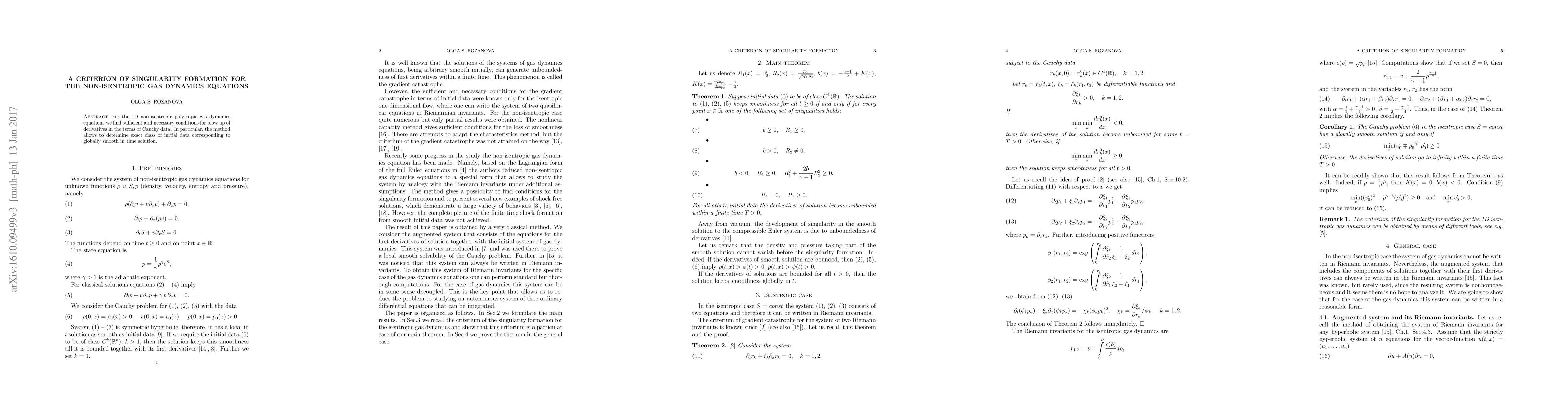 For the 1D non-isentropic polytropic gas dynamics equations we find sufficient and necessary conditions for blow up of derivatives in the terms of Cauchy data. In particular, the method allows to determine exact class of initial data corresponding to globally smooth in time solution.