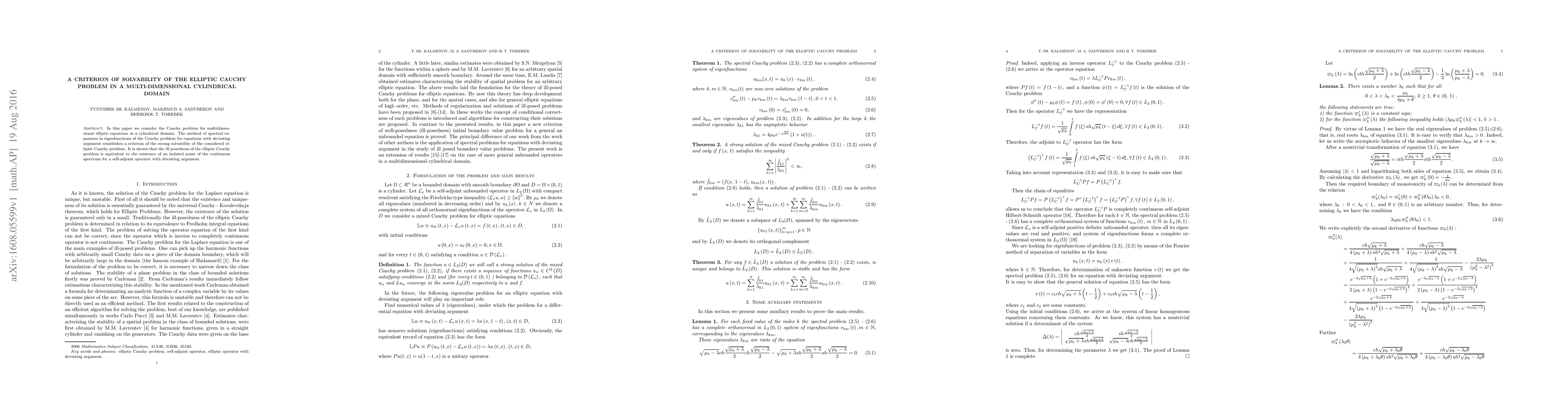 In this paper we consider the Cauchy problem for multidimensional elliptic equations in a cylindrical domain. The method of spectral expansion in eigenfunctions of the Cauchy problem for equations with deviating argument establishes a criterion of the strong solvability of the considered elliptic Cauchy problem. It is shown that the ill-posedness of the elliptic Cauchy problem is equivalent to the existence of an isolated point of the continuous spectrum for a self-adjoint operator with deviating argument.