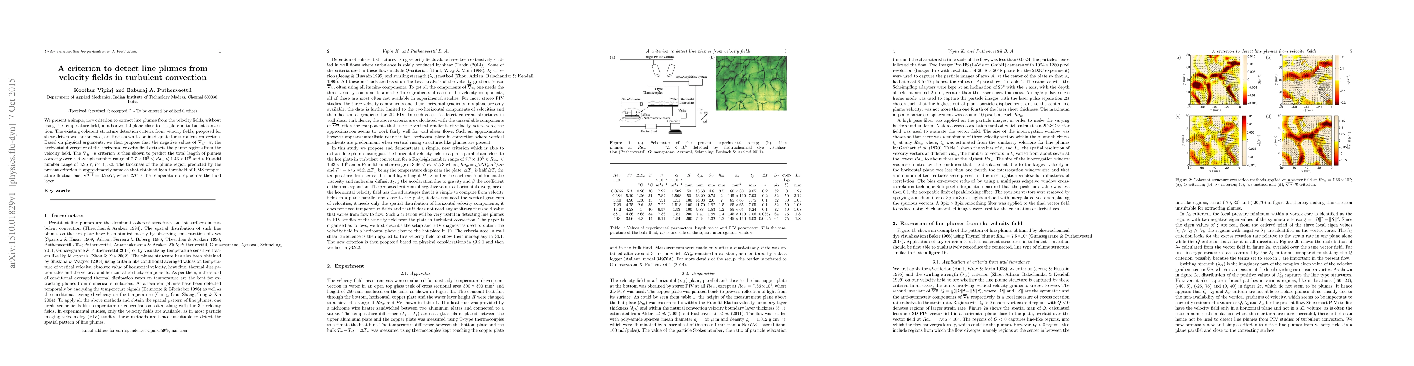 We present a simple, new criterion to extract line plumes from the velocity fields, without using the temperature field, in a horizontal plane close to the plate in turbulent convection. The existing coherent structure detection criteria from velocity fields, proposed for shear driven wall turbulence, are first shown to be inadequate for turbulent convection. Based on physical arguments, we then propose that the negative values of $\overline{\nabla_H}\cdot\overline{u}$, the horizontal divergence of the horizontal velocity field extracts the plume regions from the velocity field. The $\overline{\nabla_H}\cdot\overline{u}$ criterion is then shown to predict the total length of plumes correctly over a Rayleigh number range of $7.7\times 10^5\le Ra_w\le 1.43\times 10^9$ and a Prandtl number range of $3.96\le Pr\le 5.3$. The thickness of the plume region predicted by the present criterion is approximately same as that obtained by a threshold of RMS temperature fluctuations, $\sqrt{T'^2}=0.2 \Delta T$, where $\Delta T$ is the temperature drop across the fluid layer.