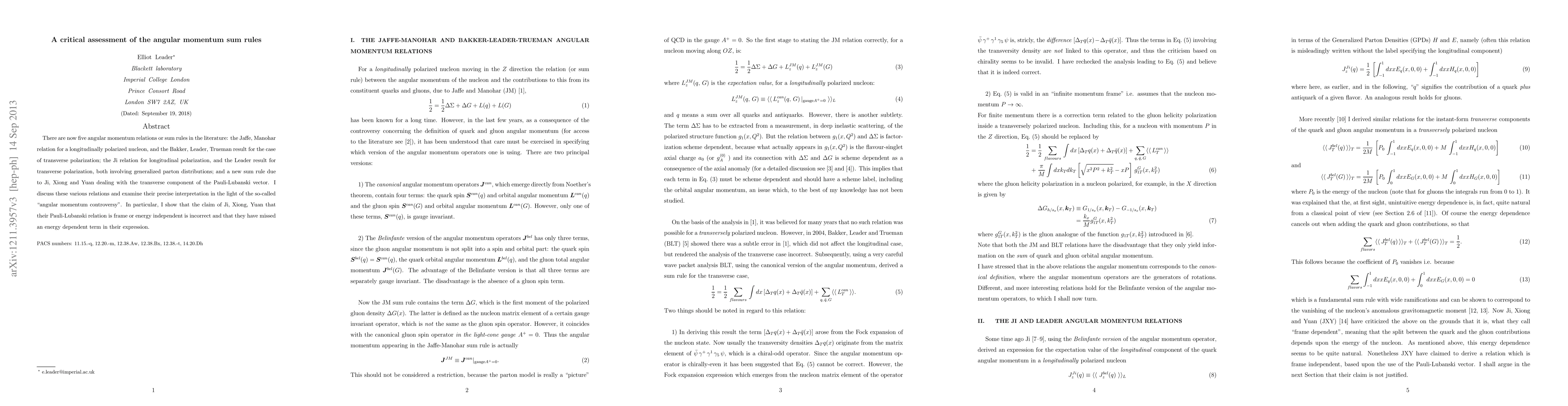 There are now five angular momentum relations or sum rules in the literature: the Jaffe, Manohar relation for a longitudinally polarized nucleon, and the Bakker, Leader, Trueman result for the case of transverse polarization; the Ji relation for longitudinal polarization, and the Leader result for transverse polarization, both involving generalized parton distributions; and a new sum rule due to Ji, Xiong and Yuan dealing with the transverse component of the Pauli-Lubanski vector. I discuss these various relations and examine their precise interpretation in the light of the so-called "angular momentum controversy". In particular, I show that the claim of Ji, Xiong and Yuan that their Pauli-Lubanski relation is frame or energy independent is incorrect, and that they have missed an energy dependent term in their expression.