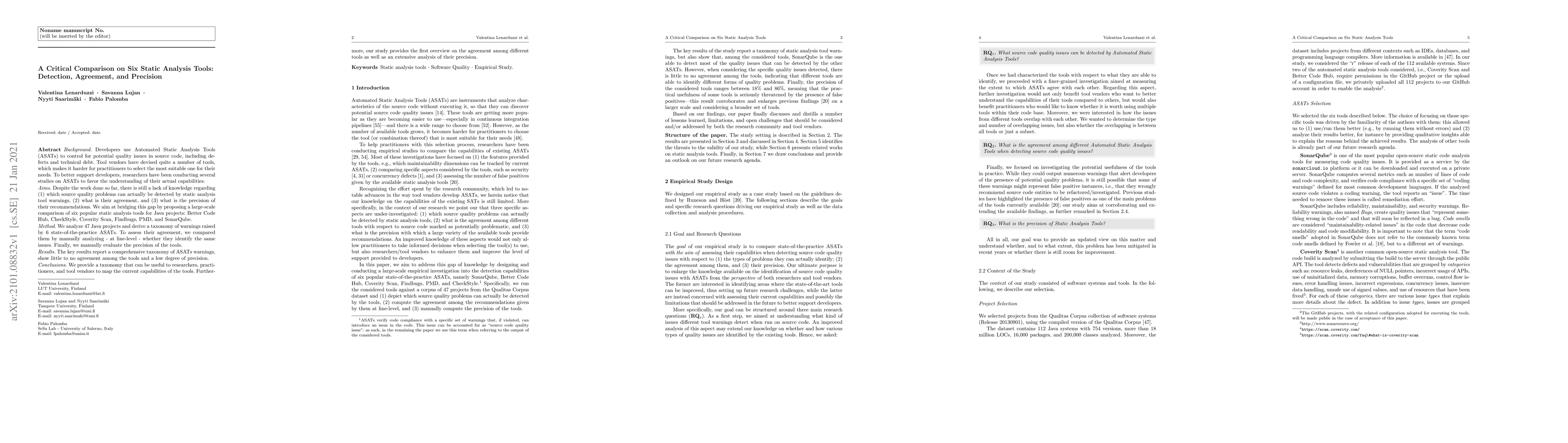 A study compares six popular static analysis tools for Java projects, finding they have little to no agreement on detecting quality issues and low precision in their recommendations.