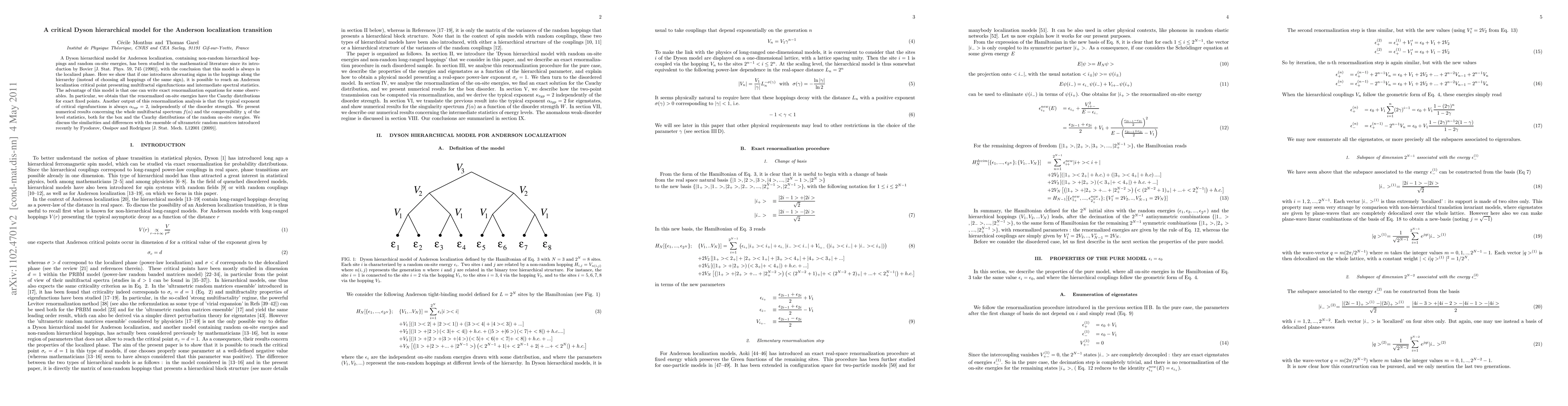 This paper explores a modified Dyson hierarchical model for Anderson localization, introducing alternating signs in hoppings to reach a critical point with multifractal eigenfunctions and intermediate spectral statistics. The study reveals exact renormalization equations and Cauchy distributions for renormalized on-site energies at fixed points, with a typical critical exponent of $\alpha_{typ}=2$.