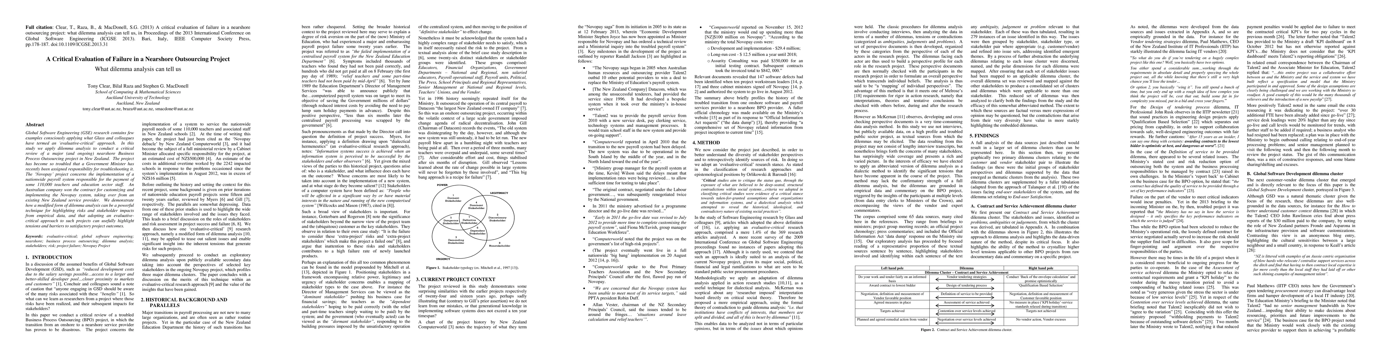 Global Software Engineering (GSE) research contains few examples consciously applying what Glass and colleagues have termed an 'evaluative-critical' approach. In this study we apply dilemma analysis to conduct a critical review of a major (and ongoing) nearshore Business Process Outsourcing project in New Zealand. The project has become so troubled that a Government Minister has recently been assigned responsibility for troubleshooting it. The 'Novopay' project concerns the implementation of a nationwide payroll system responsible for the payment of some 110,000 teachers and education sector staff. An Australian company won the contract for customizing and implementing the Novopay system, taking over from an existing New Zealand service provider. We demonstrate how a modified form of dilemma analysis can be a powerful technique for highlighting risks and stakeholder impacts from empirical data, and that adopting an evaluative-critical approach to such projects can usefully highlight tensions and barriers to satisfactory project outcomes.