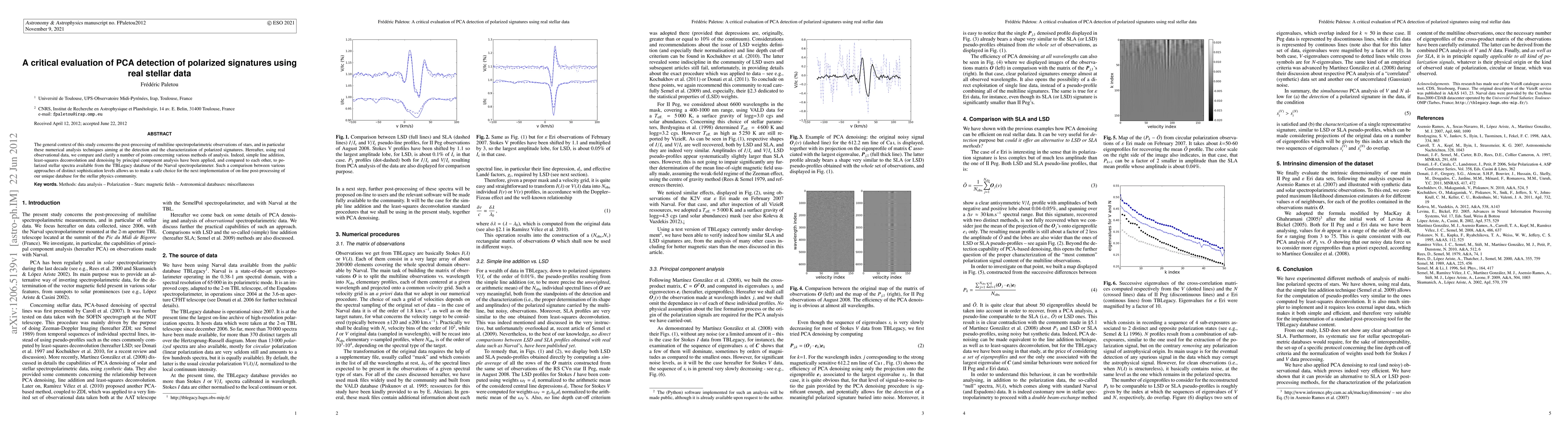 This study evaluates various PCA-based methods for detecting polarized signatures in multiline spectropolarimetric observations of stars using real data from the Narval spectropolarimeter's TBLegacy database. The comparison between simple line addition, least-squares deconvolution, and PCA denoising aims to identify the most effective technique for future on-line post-processing in stellar physics.