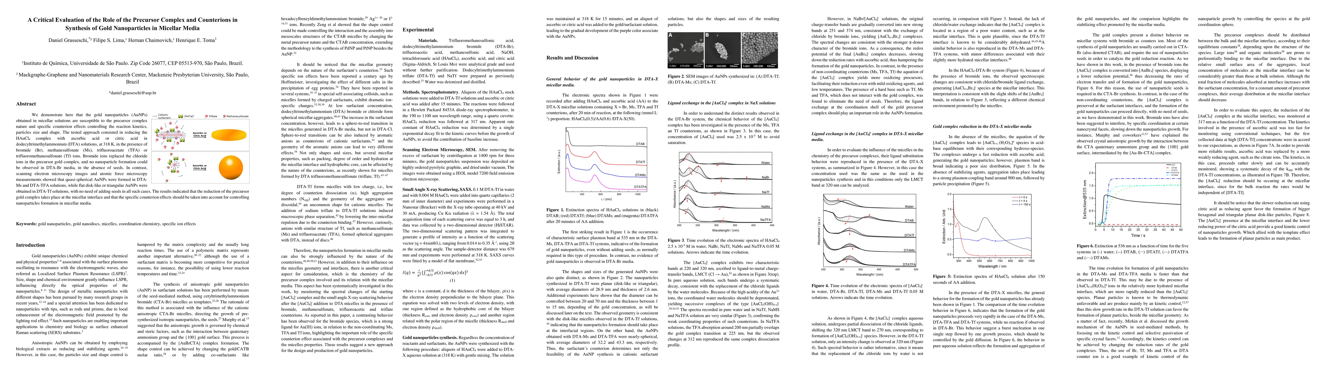 We demonstrate here that the gold nanoparticles (AuNPs) obtained in micellar solutions are susceptible to the precursor complex nature and specific counterion effects controlling the reaction kinetics, particles size and shape. The tested approach consisted in reducing the HAuCl4 complex with ascorbic acid or citric acid in dodecyltrimethylammonium (DTA) solutions, at 318 K, in the presence of bromide (Br), methanesulfonate (Ms), trifluoroacetate (TFA) or trifluoromethanesulfonate (Tf) ions. Bromide ions replaced the chloride ions in the precursor gold complex, and no nanoparticle formation could be observed in DTA-Br media, in the absence of seeds. In contrast, scanning electron microscopy images and atomic force microscopy measurements showed that quasi-spherical AuNPs were formed in DTA-Ms and DTA-TFA solutions, while flat disk-like or triangular AuNPs were obtained in DTA-Tf solutions, with no need of adding seeds in all such cases. The results indicated that the reduction of the precursor gold complex takes place at the micellar interface and that the specific counterion effects should be taken into account for controlling nanoparticles formation in micellar media.