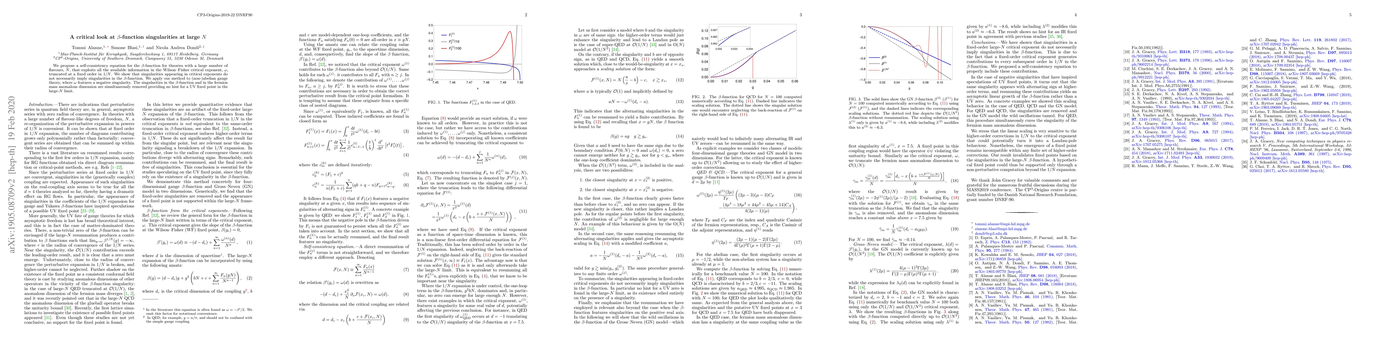 We propose a self-consistency equation for the $\beta$-function for theories with a large number of flavours, $N$, that exploits all the available information in the Wilson-Fisher critical exponent, $\omega$, truncated at a fixed order in $1/N$. We show that singularities appearing in critical exponents do not necessarily imply singularities in the $\beta$-function. We apply our method to (non-)abelian gauge theory, where $\omega$ features a negative singularity. The singularities in the $\beta$-function and in the fermion mass anomalous dimension are simultaneously removed providing no hint for a UV fixed point in the large-$N$ limit.