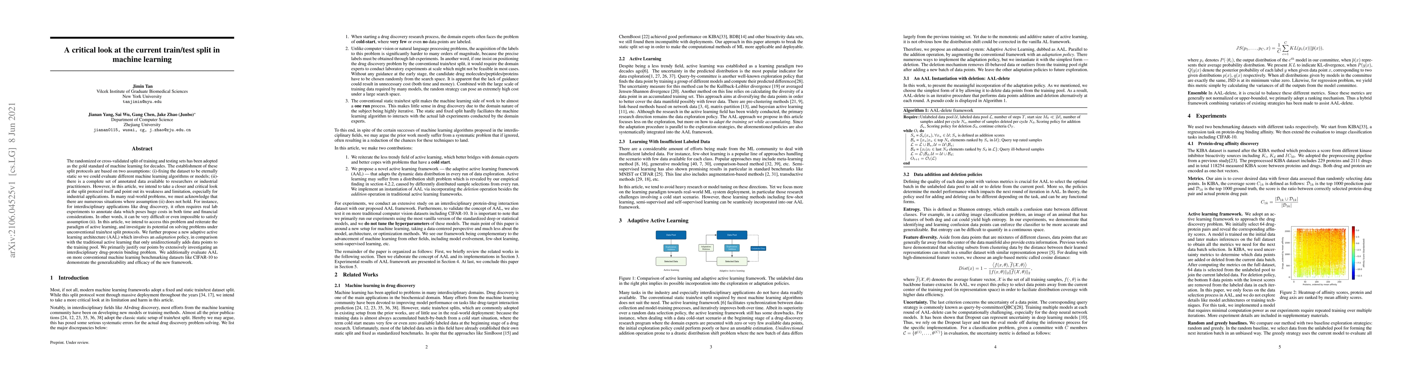 The randomized or cross-validated split of training and testing sets has been adopted as the gold standard of machine learning for decades. The establishment of these split protocols are based on two assumptions: (i)-fixing the dataset to be eternally static so we could evaluate different machine learning algorithms or models; (ii)-there is a complete set of annotated data available to researchers or industrial practitioners. However, in this article, we intend to take a closer and critical look at the split protocol itself and point out its weakness and limitation, especially for industrial applications. In many real-world problems, we must acknowledge that there are numerous situations where assumption (ii) does not hold. For instance, for interdisciplinary applications like drug discovery, it often requires real lab experiments to annotate data which poses huge costs in both time and financial considerations. In other words, it can be very difficult or even impossible to satisfy assumption (ii). In this article, we intend to access this problem and reiterate the paradigm of active learning, and investigate its potential on solving problems under unconventional train/test split protocols. We further propose a new adaptive active learning architecture (AAL) which involves an adaptation policy, in comparison with the traditional active learning that only unidirectionally adds data points to the training pool. We primarily justify our points by extensively investigating an interdisciplinary drug-protein binding problem. We additionally evaluate AAL on more conventional machine learning benchmarking datasets like CIFAR-10 to demonstrate the generalizability and efficacy of the new framework.