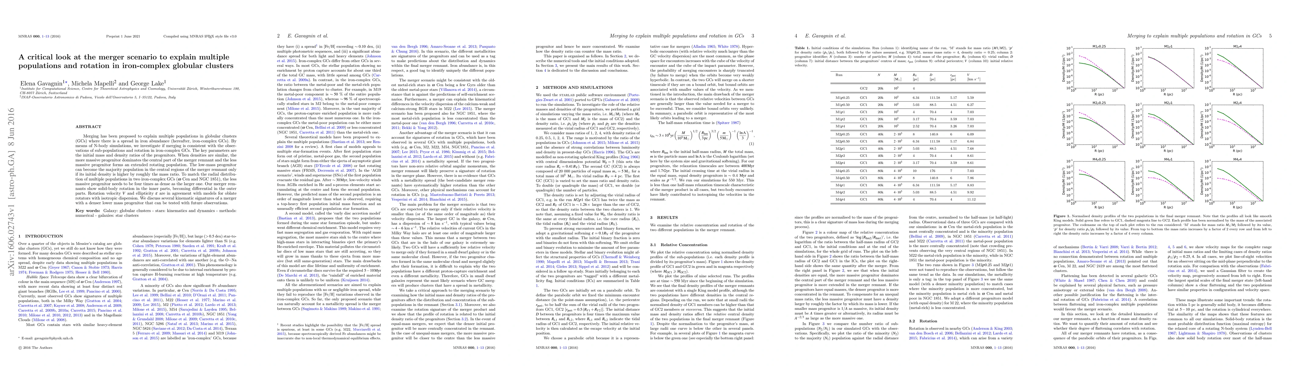 Merging has been proposed to explain multiple populations in globular clusters (GCs) where there is a spread in iron abundance (hereafter, iron-complex GCs). By means of N-body simulations, we investigate if merging is consistent with the observations of sub-populations and rotation in iron-complex GCs. The key parameters are the initial mass and density ratios of the progenitors. When densities are similar, the more massive progenitor dominates the central part of the merger remnant and the less massive progenitor forms an extended rotating population. The low-mass progenitor can become the majority population in the central regions of the merger remnant only if its initial density is higher by roughly the mass ratio. To match the radial distribution of multiple populations in two iron-complex GCs ({\omega} Cen and NGC 1851), the less massive progenitor needs to be four times as dense as the larger one. Our merger remnants show solid-body rotation in the inner parts, becoming differential in the outer parts. Rotation velocity V and ellipticity {\epsilon} are in agreement with models for oblate rotators with isotropic dispersion. We discuss several kinematic signatures of a merger with a denser lower mass progenitor that can be tested with future observations.