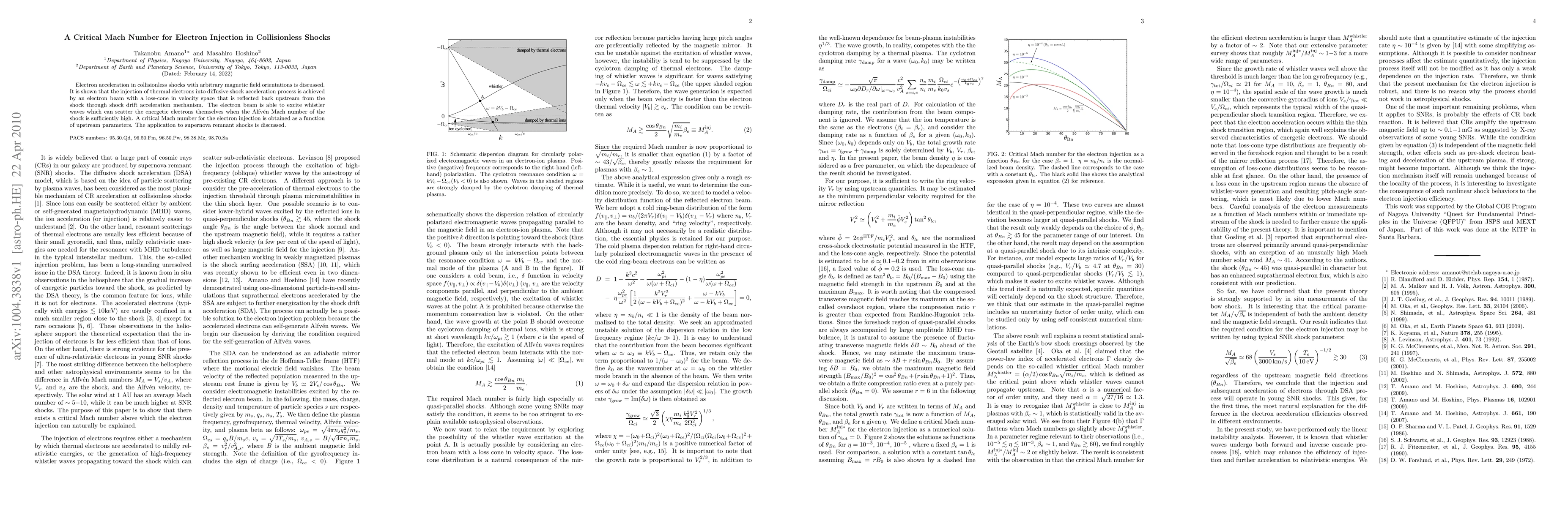 This paper investigates electron acceleration in collisionless shocks, demonstrating that thermal electrons are injected into the diffusive shock acceleration process via a beam-induced loss-cone mechanism. A critical Mach number is identified that determines when whistler waves are excited, facilitating electron scattering, with implications for supernova remnant shocks.
