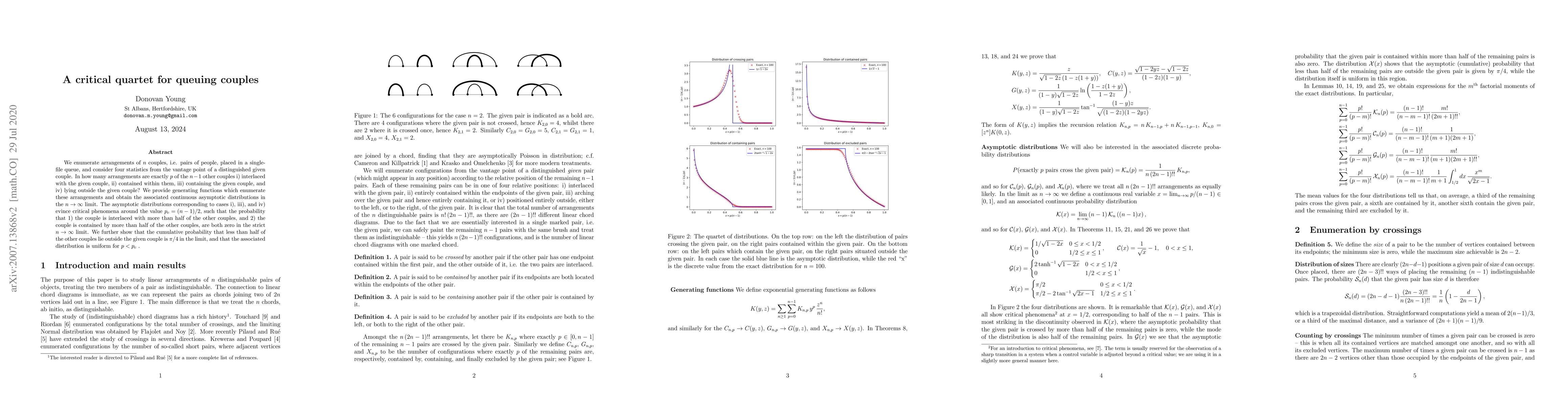 This paper enumerates arrangements of $n$ couples in a queue and analyzes four statistics related to a distinguished couple. It finds critical phenomena around $p_c=(n-1)/2$ and shows uniform distribution for $p<p_c$, with asymptotic probabilities of interlacing and containment converging to zero as $n$ approaches infinity.