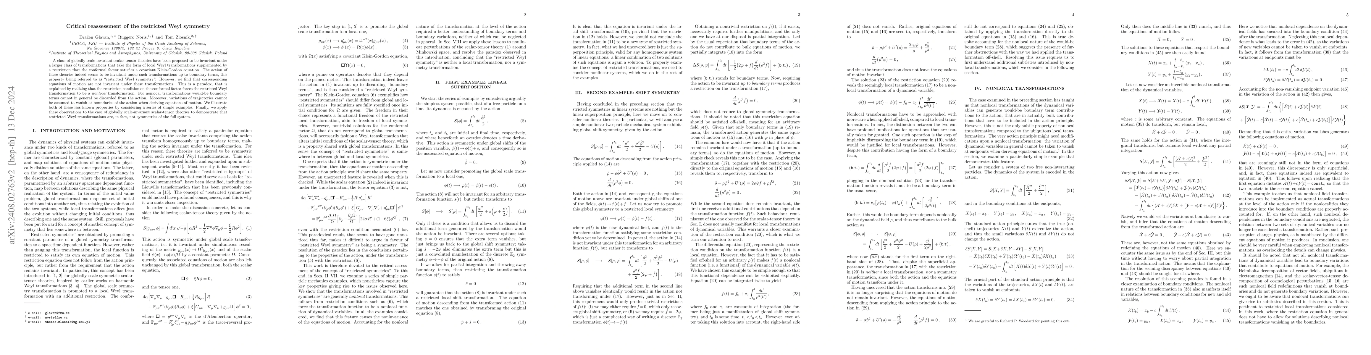 A class of globally scale-invariant scalar-tensor theories have been proposed to be invariant under a larger class of transformations that take the form of local Weyl transformations supplemented by a restriction that the conformal factor satisfies a covariant Klein-Gordon equation. The action of these theories indeed seems to be invariant under such transformations up to boundary terms, this property being referred to as "restricted Weyl symmetry". However, we find that corresponding equations of motion are not invariant under these transformations. This is a paradox, that is explained by realizing that the restriction condition on the conformal factor forces the "restricted Weyl transformation" to be a nonlocal transformation. For nonlocal transformations would-be boundary terms cannot in general be discarded from the action. Moreover, variations of trajectories cannot be assumed to vanish at boundaries of the action when deriving equations of motion. We illustrate both of these less known properties by considering a series of simple examples. Finally, we apply these observations to the case of globally scale-invariant scalar-tensor theories to demonstrate that "restricted Weyl transformations" are, in fact, not symmetries of the full system.