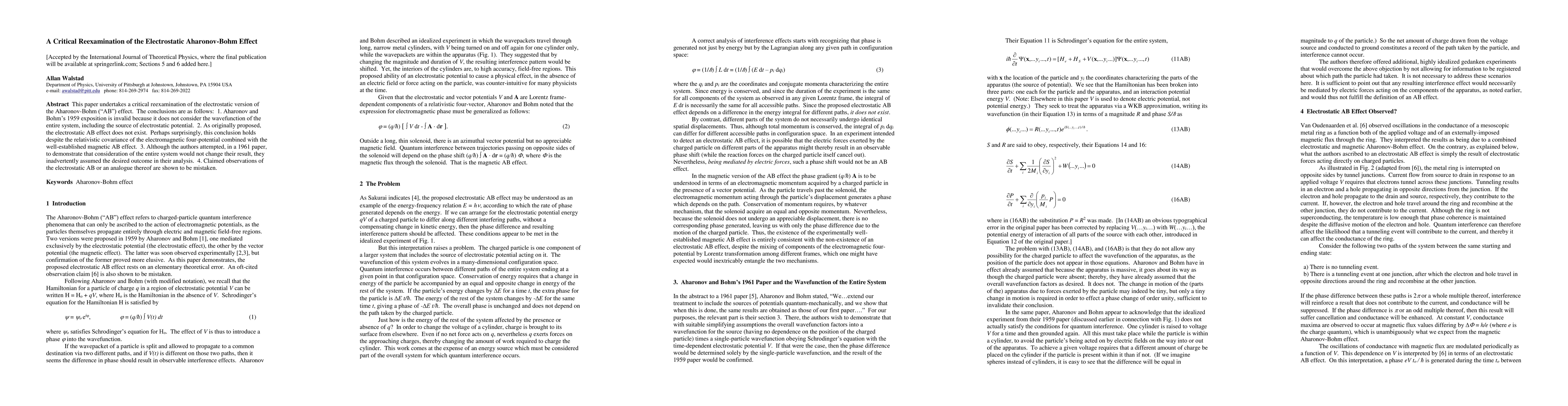 This paper undertakes a critical reexamination of the electrostatic version of the Aharonov-Bohm ("AB") effect. The conclusions are as follows: 1. Aharonov and Bohm's 1959 exposition is invalid because it does not consider the wavefunction of the entire system, including the source of electrostatic potential. 2. As originally proposed, the electrostatic AB effect does not exist. Perhaps surprisingly, this conclusion holds despite the relativistic covariance of the electromagnetic four-potential combined with the well-established magnetic AB effect. 3. Although the authors attempted, in a 1961 paper, to demonstrate that consideration of the entire system would not change their result, they inadvertently assumed the desired outcome in their analysis. 4. Claimed observations of the electrostatic AB effect or an analogue thereof are shown to be mistaken.