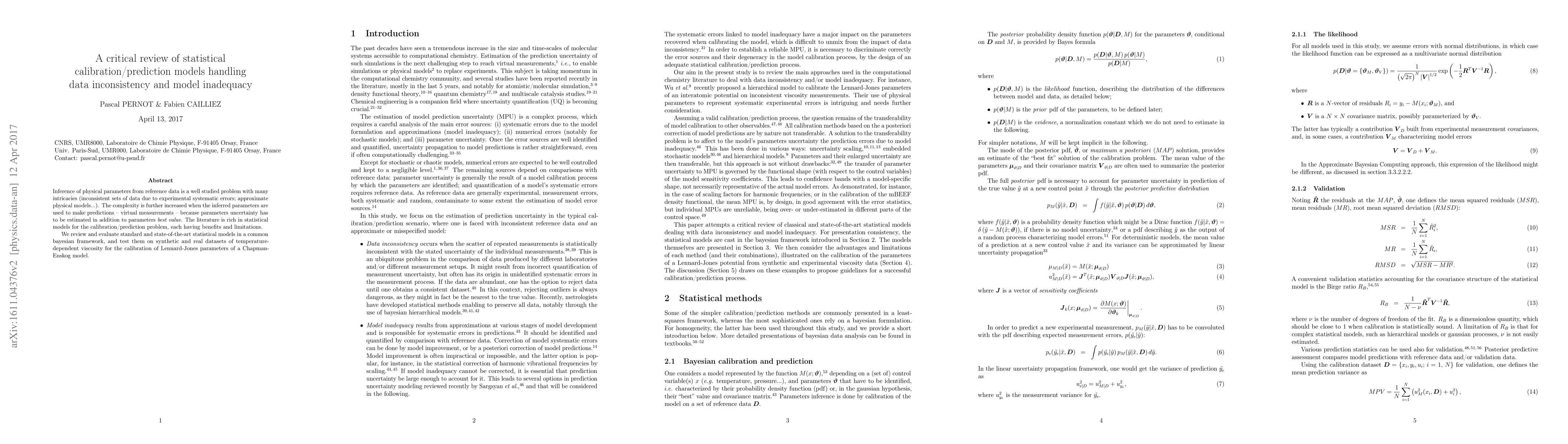 Inference of physical parameters from reference data is a well studied problem with many intricacies (inconsistent sets of data due to experimental systematic errors, approximate physical models...). The complexity is further increased when the inferred parameters are used to make predictions (virtual measurements) because parameters uncertainty has to be estimated in addition to parameters best value. The literature is rich in statistical models for the calibration/prediction problem, each having benefits and limitations. We review and evaluate standard and state-of-the-art statistical models in a common bayesian framework, and test them on synthetic and real datasets of temperature-dependent viscosity for the calibration of Lennard-Jones parameters of a Chapman-Enskog model.