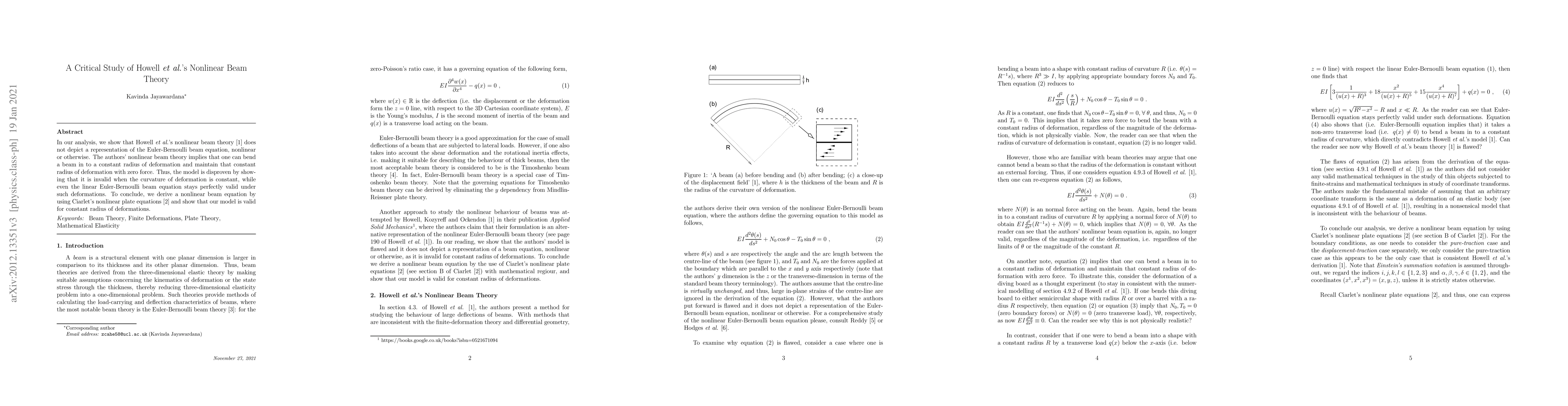 This paper critiques Howell et al.'s nonlinear beam theory, demonstrating it does not align with the Euler-Bernoulli equation. It disproves their model for constant radius deformation, showing the Euler-Bernoulli equation remains valid. The authors then present a new nonlinear beam equation based on Ciarlet's nonlinear plate equations, validating it for constant radius deformations.