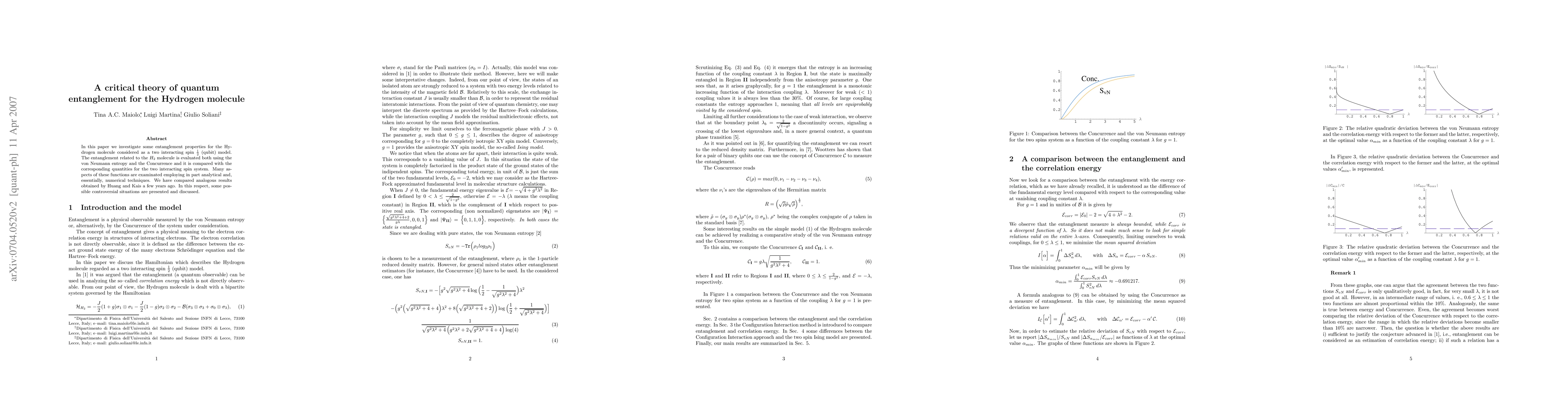 This paper examines entanglement properties in the Hydrogen molecule modeled as a two-qubit system, using von Neumann entropy and Concurrence. It compares these measures with those of a two-interacting spin system, discussing potential discrepancies with previous studies by Huang and Kais.