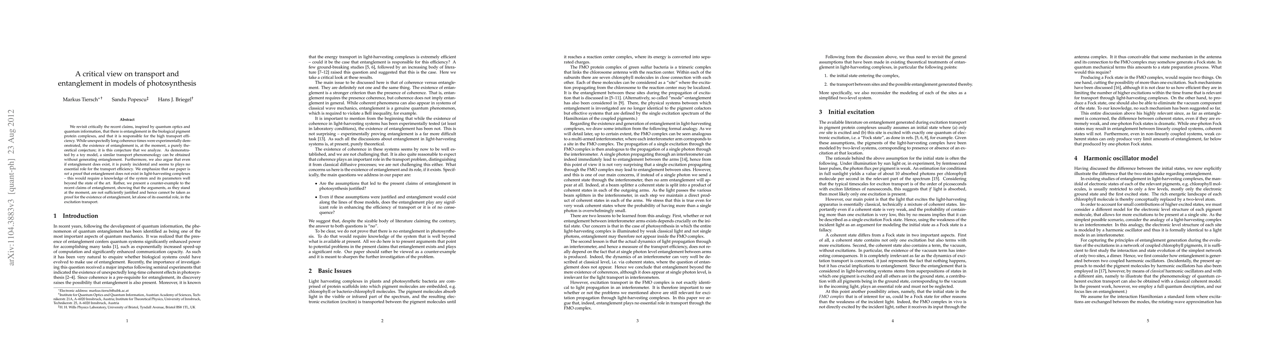 We revisit critically the recent claims, inspired by quantum optics and quantum information, that there is entanglement in the biological pigment protein complexes, and that it is responsible for the high transport efficiency. While unexpectedly long coherence times were experimentally demonstrated, the existence of entanglement is, at the moment, a purely theoretical conjecture; it is this conjecture that we analyze. As demonstrated by a toy model, a similar transport phenomenology can be obtained without generating entanglement. Furthermore, we also argue that even if entanglement does exist, it is purely incidental and seems to plays no essential role for the transport efficiency. We emphasize that our paper is not a proof that entanglement does not exist in light-harvesting complexes - this would require a knowledge of the system and its parameters well beyond the state of the art. Rather, we present a counter-example to the recent claims of entanglement, showing that the arguments, as they stand at the moment, are not sufficiently justified and hence cannot be taken as proof for the existence of entanglement, let alone of its essential role, in the excitation transport.