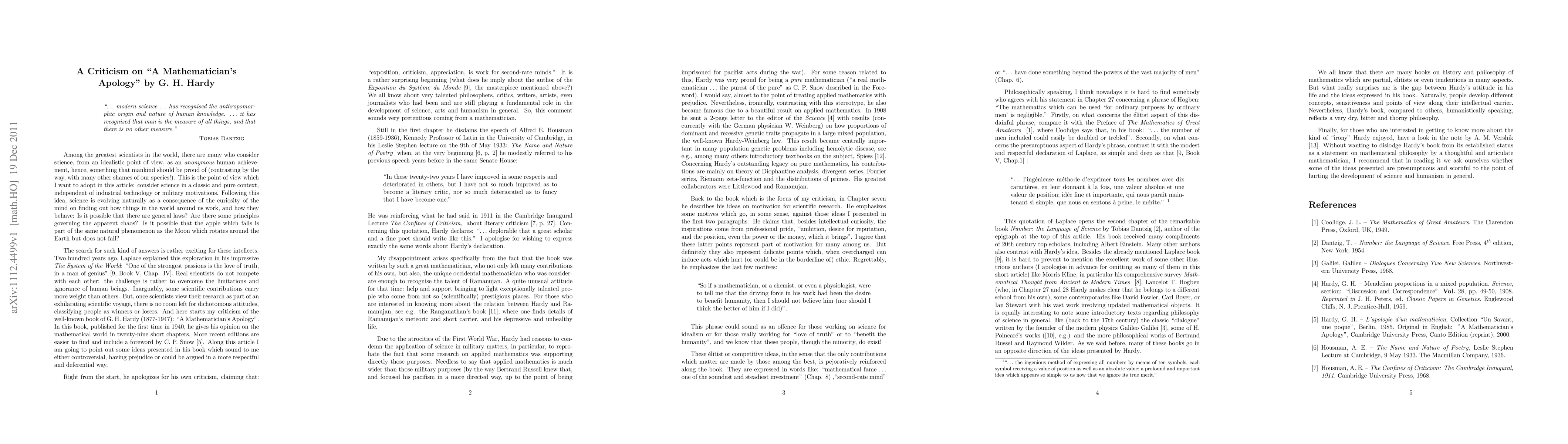 This paper critiques G. H. Hardy's "A Mathematician's Apology," examining its philosophical arguments and evaluating the validity of its perspectives on mathematics and the mathematician's role in society. It challenges some of Hardy's assertions and offers alternative viewpoints on the nature of mathematical creativity and beauty.