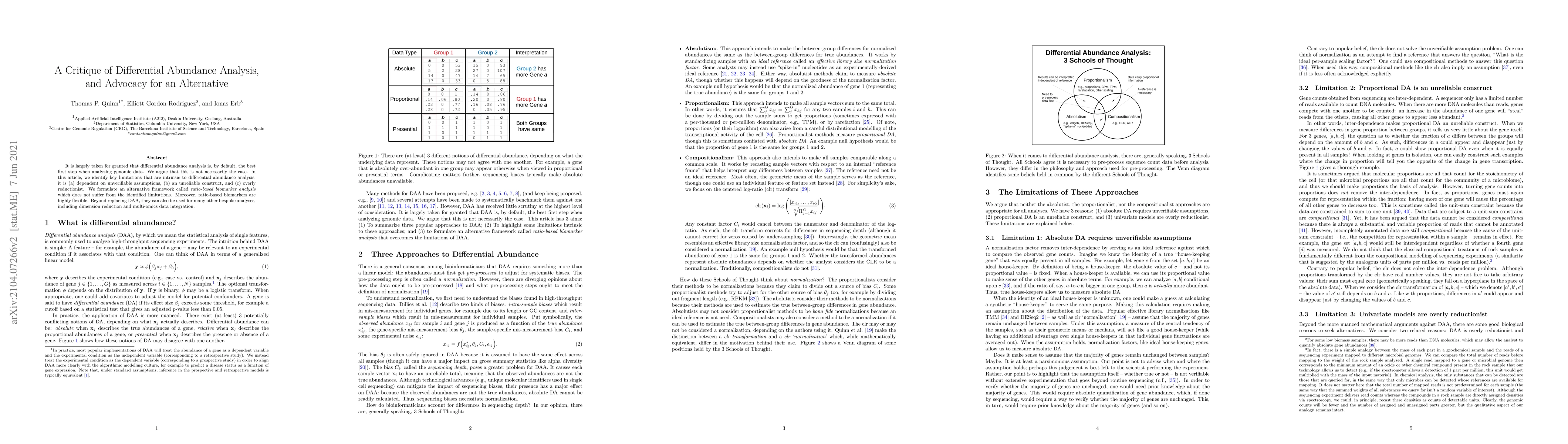 The paper critiques differential abundance analysis (DAA) and proposes an alternative framework called ratio-based biomarker analysis (RBB). RBB is algebraically straightforward and flexible, allowing for various aggregation methods based on expert knowledge or data-driven approaches, and can be implemented using open-source software tools.