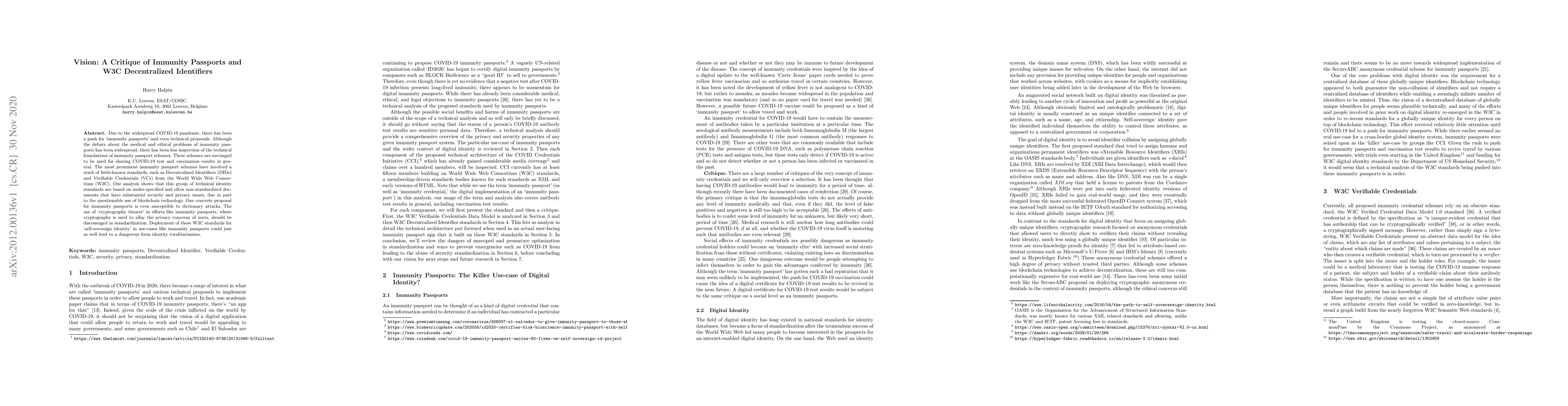 Due to the widespread COVID-19 pandemic, there has been a push for `immunity passports' and even technical proposals. Although the debate about the medical and ethical problems of immunity passports has been widespread, there has been less inspection of the technical foundations of immunity passport schemes. These schemes are envisaged to be used for sharing COVID-19 test and vaccination results in general. The most prominent immunity passport schemes have involved a stack of little-known standards, such as Decentralized Identifiers (DIDs) and Verifiable Credentials (VCs) from the World Wide Web Consortium (W3C). Our analysis shows that this group of technical identity standards are based on under-specified and often non-standardized documents that have substantial security and privacy issues, due in part to the questionable use of blockchain technology. One concrete proposal for immunity passports is even susceptible to dictionary attacks. The use of `cryptography theater' in efforts like immunity passports, where cryptography is used to allay the privacy concerns of users, should be discouraged in standardization. Deployment of these W3C standards for `self-sovereign identity' in use-cases like immunity passports could just as well lead to a dangerous form identity totalitarianism.