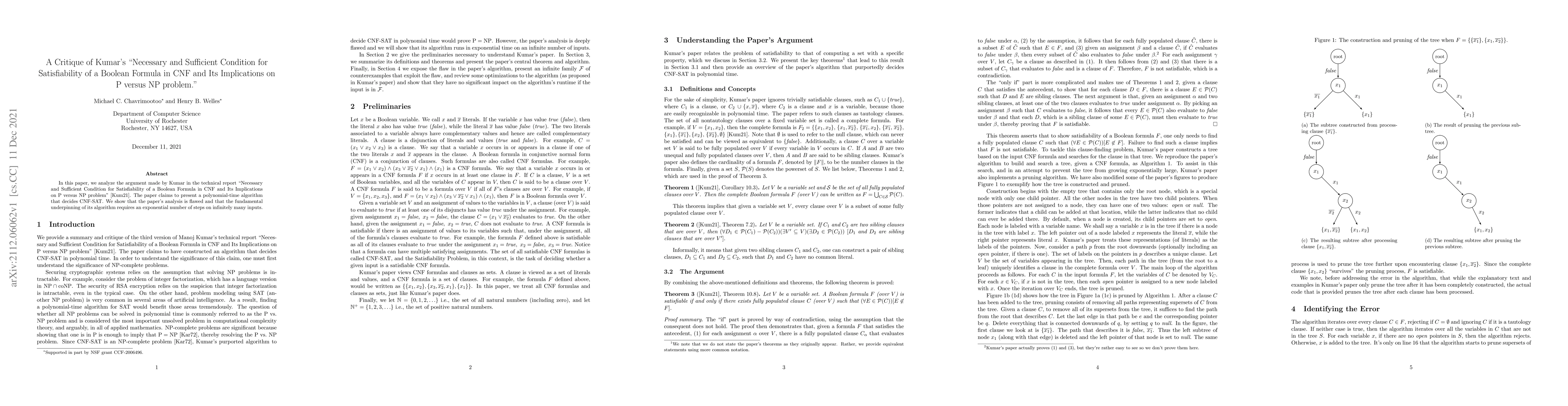 In this paper, we analyze the argument made by Kumar in the technical report "Necessary and Sufficient Condition for Satisfiability of a Boolean Formula in CNF and Its Implications on P versus NP problem." The paper claims to present a polynomial-time algorithm that decides CNF-SAT. We show that the paper's analysis is flawed and that the fundamental underpinning of its algorithm requires an exponential number of steps on infinitely many inputs.