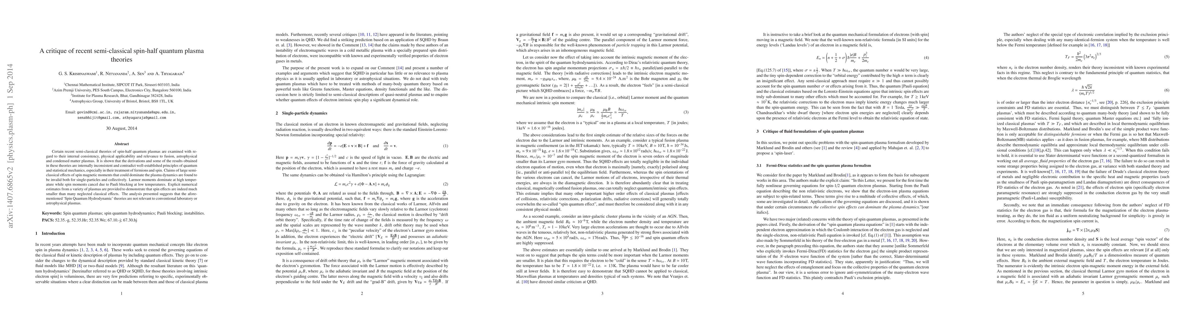 This paper critiques recent semi-classical spin-half quantum plasma theories, finding internal inconsistencies and contradictions with established quantum and statistical mechanics principles. It concludes that claims of significant spin effects in plasma dynamics are invalid, with Larmor moments prevailing at high temperatures and spin effects negligible at low temperatures.