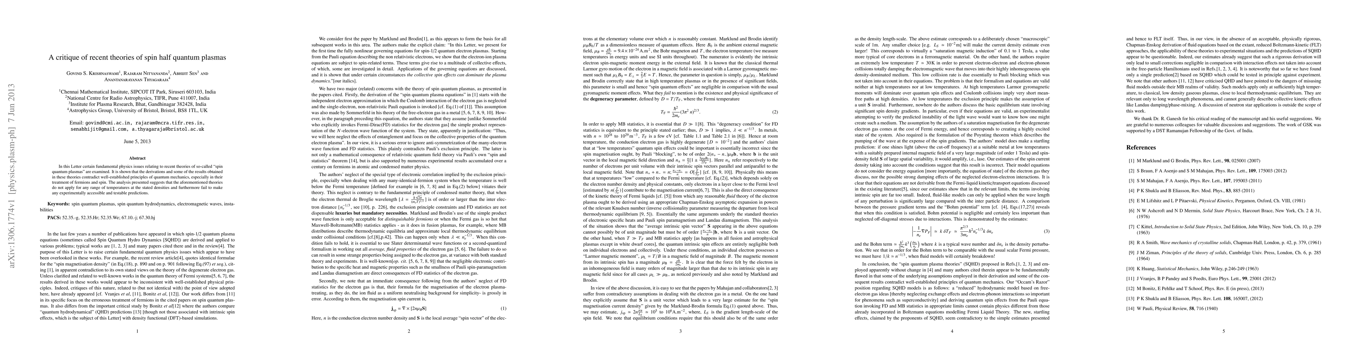 This paper critiques recent theories of spin half quantum plasmas, demonstrating that their derivations and results conflict with established quantum mechanics principles, particularly regarding fermions and spin, and that they fail to provide experimentally testable predictions.