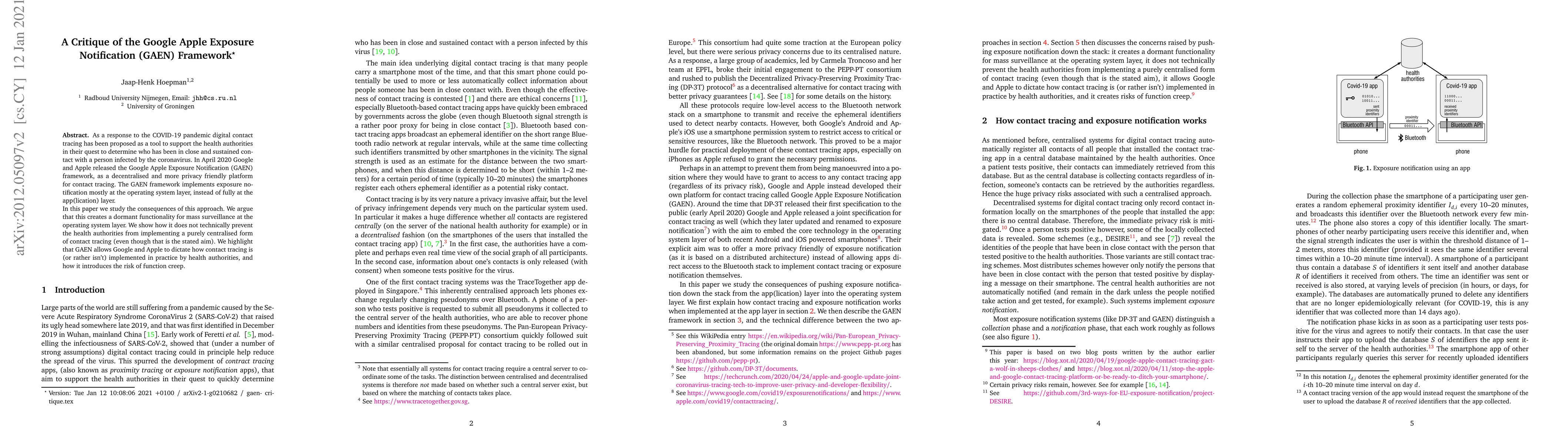This paper critiques the Google Apple Exposure Notification (GAEN) framework for its potential to enable mass surveillance and centralized contact tracing despite its privacy-friendly claims. It argues that the framework's implementation at the operating system level allows for latent surveillance capabilities and risks function creep, undermining its intended decentralized approach.
